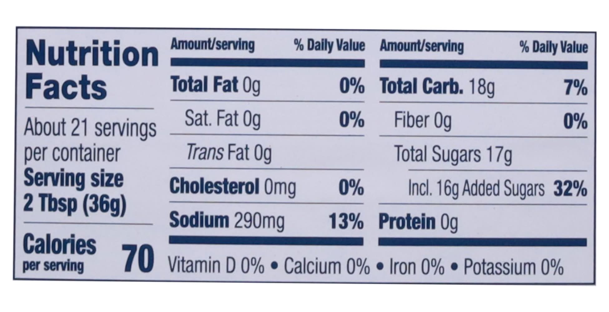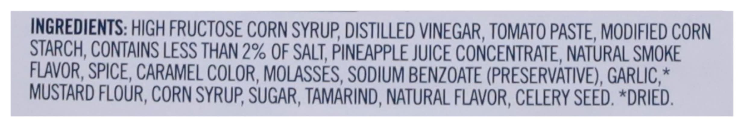 Ingredients: High Fructose Corn Syrup, Distilled Vinegar, Tomato Paste, Modified Corn Starch, Contains Less than 2% of Salt, Pineapple Juice Concentrate, Natural Smoke Flavor, Spice, Caramel Color, Molasses, Sodium Benzoate (Preservative), Garlic*. Mustard Flour, Corn Syrup, Sugar, Tamarind, Natural Flavor, Celery Seed. * Dried