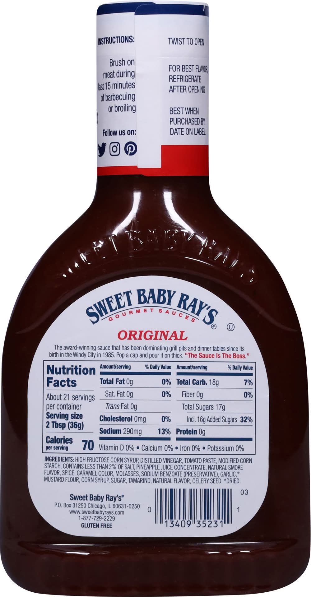 Gluten free. Gourmet sauces. The award-winning sauce that has been dominating grill pits and dinner tables since its birth in the Windy City in 1985. Pop a cap and pour it on thick. • Sweet Baby Ray's, PO Box 31250, Chicago, IL, 60631 • Packaging: Reusable
