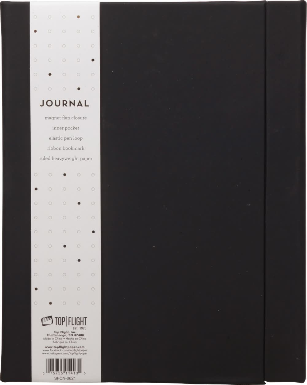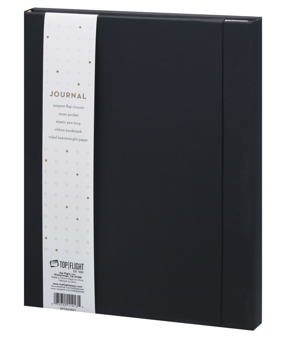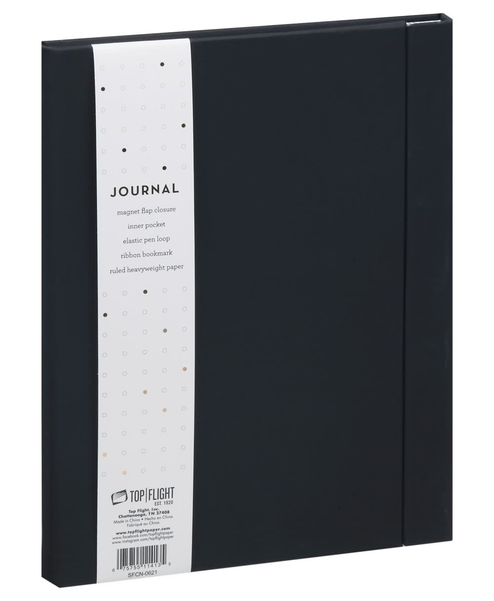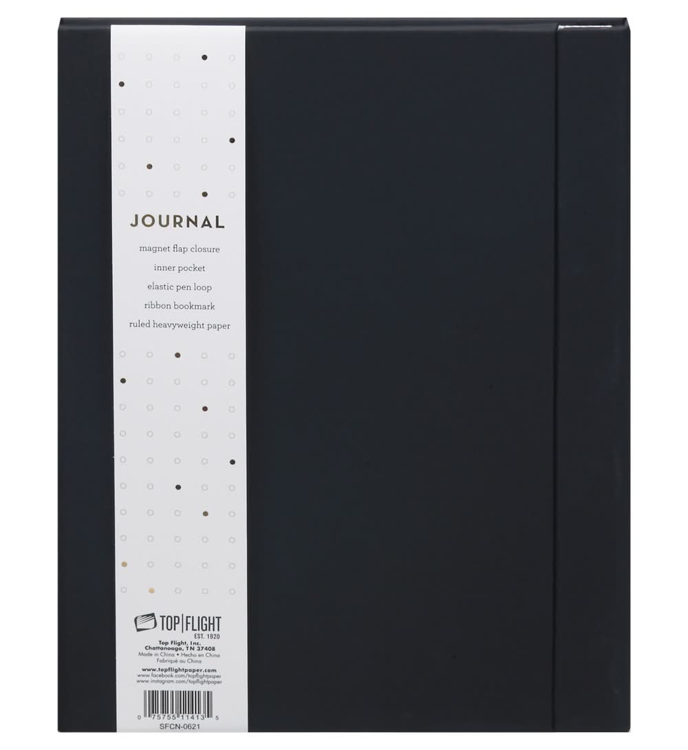 Magnet flap closure. Inner pocket. Elastic pen loop. Ribbon bookmark. Ruled heavyweight paper. Est 1920. www.topflightpaper.com. www.facebook.com/topflightpaper. www.instagramcom/topflightpaper. Made in China. Top Flight, Inc., Chattanooga, TN, 37408