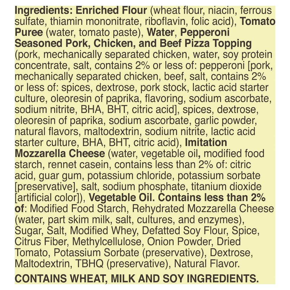 Ingredients: Enriched Flour Wheat Flour, Niacin, Ferrous Sulfate, Thiamin Mononitrate, Riboflavin, Folic Acid, Tomato Puree Water, Tomato Paste, Water, Pepperoni Seasoned Pork, Chicken and Beef Pizza Topping Pork, Mechanically Separated Chicken, Water, Soy Protein Concentrate, Salt, Contains 2% or Less of: Pepperoni Pork, Mechanically Separated Chicken, Beef, Salt, Contains 2% or Less of: Spices, Dextrose, Pork Stock, Lactic Acid Starter Culture, Oleoresin of Paprika, Flavoring, Sodium Ascorbate, Sodium Nitrite, BHA, BHT, Citric Acid, Spices, Dextrose, Oleoresin of Paprika, Sodium Ascorbate, Garlic Powder, Natural Flavors, Maltodextrin, Sodium Nitrite, Lactic Acid Starter Culture, BHA, BHT, Citric Acid, Imitation Mozzarella Cheese Water, Palm Oil, Modified Corn Starch, Vegetable Oil, Rennet Casein, Salt, Sodium Aluminum Phosphate, Potassium Chloride, Citric Acid, Guar Gum, Potassium Sorbate Preservative], Sodium Citrate, Sodium Phosphate, Titanium Dioxide Artificial Color], Vegetable Oil, Contains Less than 2% of: Modified Food Starch, Rehydrated Fat Free Mozzarella Cheese Water, Skim Milk, Cheese Cultures, Salt, Enzymes, Citric Acid, Sugar, Salt, Modified Whey, Defatted Soy Flour, Dried Onion, Spice, Methylcellulose, Potassium Sorbate Preservative, Rehydrated Enzyme Modified Cheese Water, Milk, Cheese Cultures, Salt, Enzymes, Dextrose, Maltodextrin, TBHQ Preservative, Natural Flavor., Sea Salt Sodium Bicarbonate. Contains: Wheat, Milk, Soybeans
