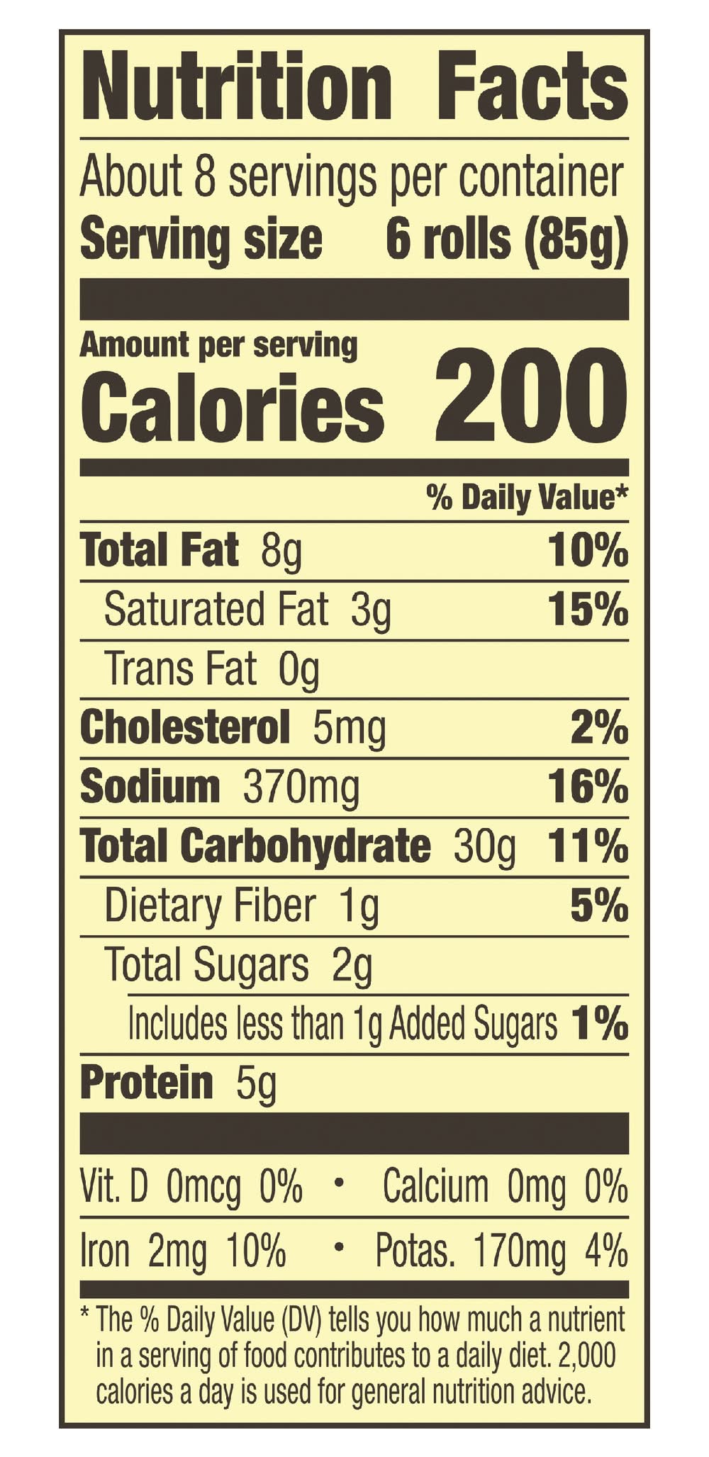 Directions for use: Cook thoroughly. Directions: For food safety and quality follow cooking directions. Cook thoroughly to internal temperature of at least 160 degrees F. Keep frozen until ready to cook. Refrigerate leftovers. Classic: Oven & Toaster Oven: Do not leave toaster oven unattended while cooking product. 1) Heat oven to 425 degrees F. 2) Place rolls in single layer on baking sheet or toaster oven tray. Bake according to chart. 3) Let stand 2 minutes to complete cooking. Filling will be very hot. Be cautious on first bite. Quantity: Half bag; Oven: 11 to 13 minutes; Toaster Oven: 14 to 16 minutes. Quantity: Full bag; Oven: 14 to 16 minutes; Toaster Oven: Not recommended. Fast: Microwave: Do not leave microwave unattended while cooking product. 1) Place rolls in single layer on microwavable plate. 2) Microwave on high according to chart. 3) Let stand 2 minutes to complete cooking. Filling will be very hot. Be cautious on first bite. Quantity: 1 serving (6 rolls); Time on High: 1:00 to 1:15. Quantity: 2 servings (12 rolls); Time on High: 2:00 to 2:40. Crispy: Air Fryer: Do not leave air fryer unattended while cooking product. 1) Place up to 25 rolls in single layer in air fryer basket. 2) Cook 4 minutes at 390 degrees F. Remove basket; shake well to mix rolls. Cook an additional 4 minutes. 3) Let stand 2 minutes to complete cooking. Filling will be very hot. Be cautious on first bite. Directions developed using 4-quarts air fryer; cooking times may need to be adjusted. Directions developed using 4-quart. air fryers; cook times may need to be adjusted. Caution: Filling will be very hot! Wait until cool enough to eat. Storage recommendation: Keep frozen.