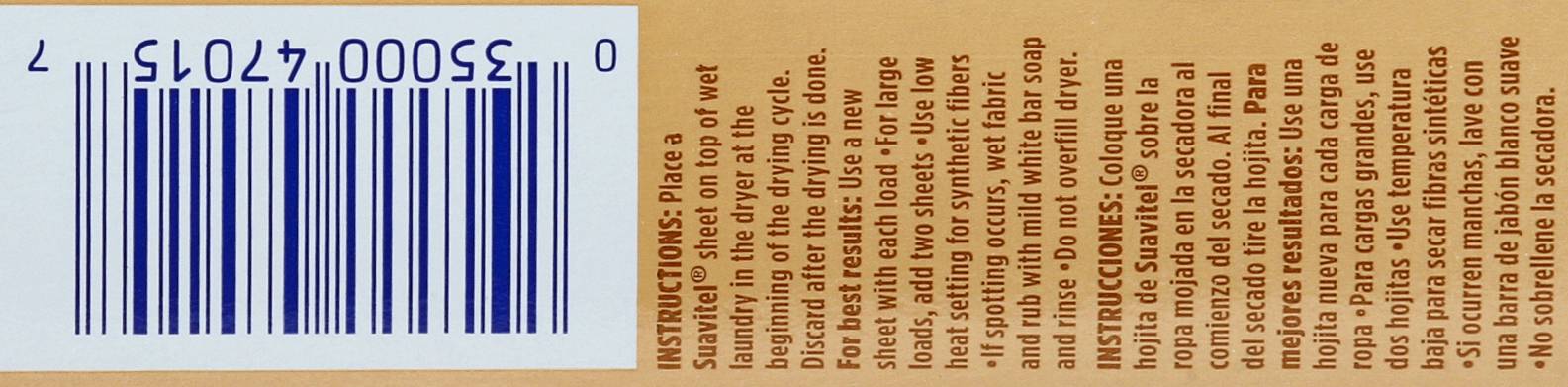 Instructions: Place a Suavitel sheet on top of wet laundry in the dryer at the beginning of the drying cycle. Discard after the drying is done. For best results: Use a new sheet with each load. For large loads, add two sheets. Use low heat setting for synthetic fibers. If spotting occurs, wet fabric and rub with mild white bar soap and rinse. Do not overfill dryer.
