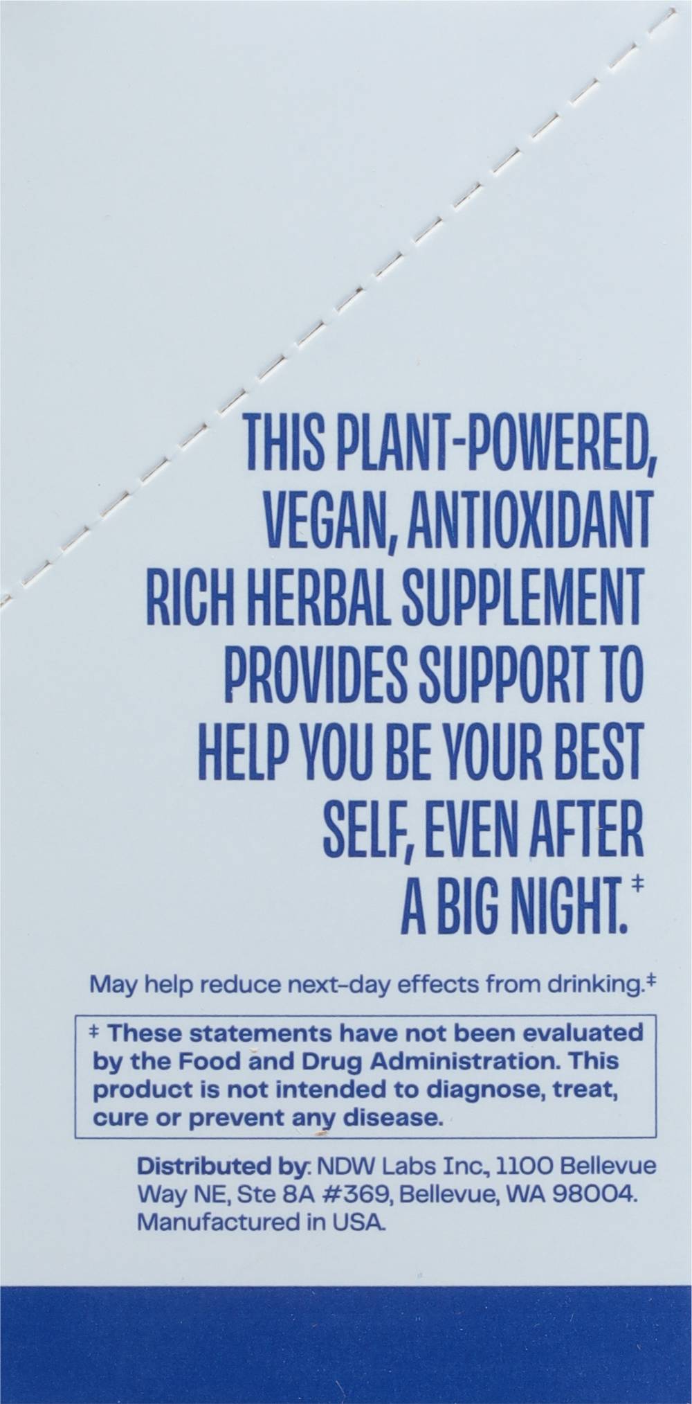 Herbal Supplement. Vegan. Take when you celebrate. Take tonight - Wake up fresh. This plant-powered, vegan, antioxidant rich herbal supplement provides support to help you be your best self, even after a big night. May help reduce next-day effects from drinking (These statements have not been evaluated by the Food and Drug Administration. This product is not intended to diagnose, treat, cure or prevent any disease.) Manufactured in USA. Packaging: Reusable
