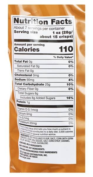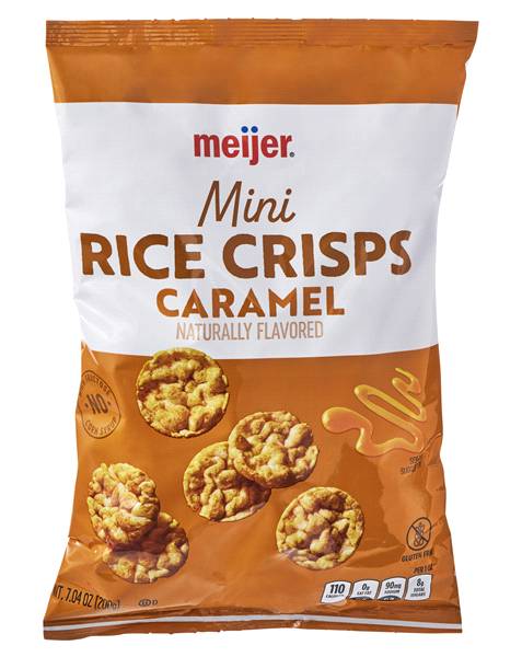 Meijer Caramel Rice Crisps are baked snacks flavored with caramel, designed to satisfy cravings for both sweetness and crunch. These crisps are fat-free and intended as a low-calorie option for snacking.