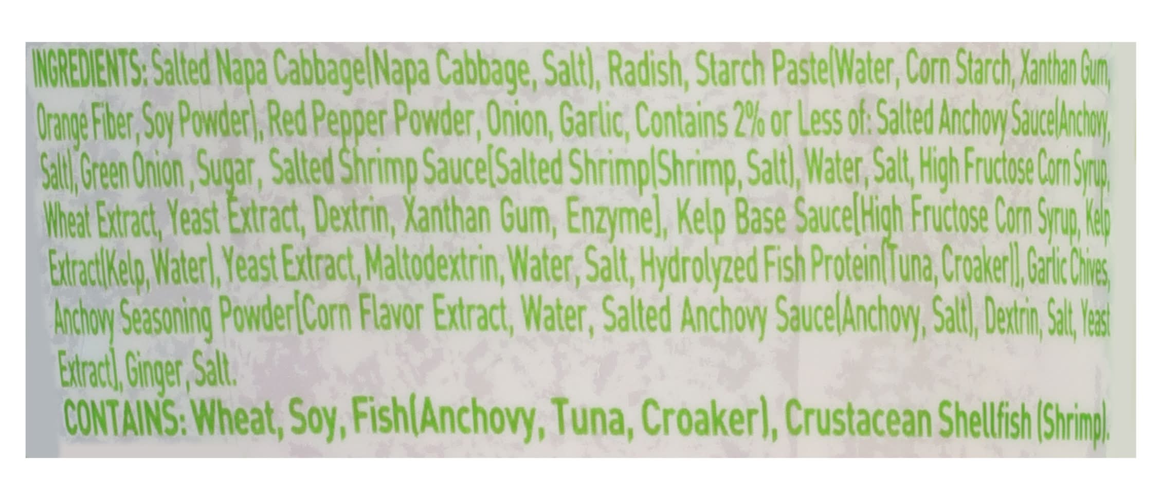 Salted Napa Cabbage (Napa Cabbage, Salt), Radish, Starch Paste (Water, Corn Starch, Xanthan Gum, Orange Fiber, Soy Powder), Red Pepper Powder, Onion, Garlic, Contains 2% or Less of: Salted Anchovy Sauce (Anchovy, Salt), Green Onion, Sugar, Salted Shrimp Sauce [Salted Shrimp (Shrimp, Salt), Water, Salt, High Fructose Corn Syrup, Wheat Extract, Yeast Extract, Dextrin, Xanthan Gum, Enzyme], Kelp Base Sauce [High Fructose Corn Syrup, Kelp Extract (Kelp, Water), Yeast Extract, Maltodextrin, Water, Salt, Hydrolyzed Fish Protein (Tuna, Croaker)], Garlic Chives, Anchovy Seasoning Powder [Corn Flavor Extract, Water, Salt Anchovy Sauce (Anchovy, Salt), Dextrin, Salt, Yeast Extract), Ginger, Salt Contains: Wheat, Soybeans, Fish, Anchovy, Fish, Tuna, Crustacean Shellfish, Shrimp, Corn