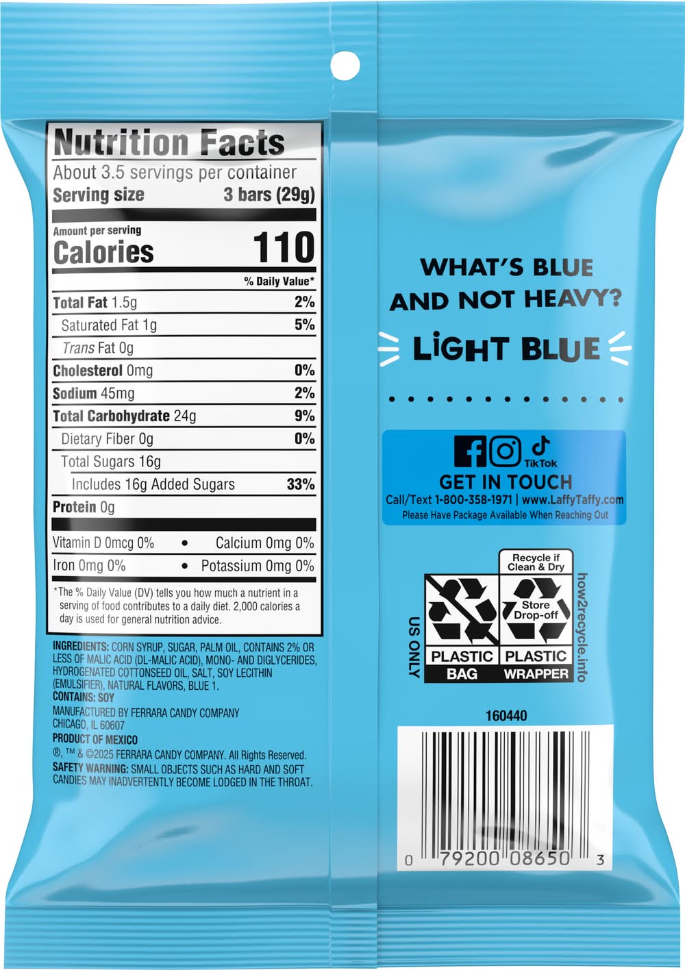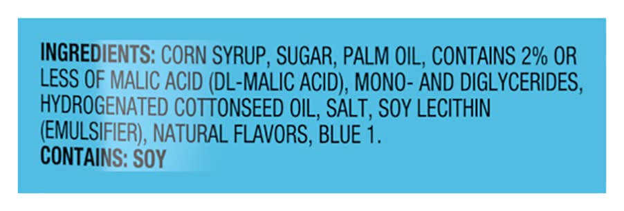 Ingredients: Corn Syrup, Sugar, Palm Oil, Contains 2% or Less of Malic Acid (DL-Malic Acid), Mono- and Diglycerides, Hydrogenated Cottonseed Oil, Salt, Soy Lecithin (Emulsifier), Natural Flavors, Blue 1 Contains: Soybeans