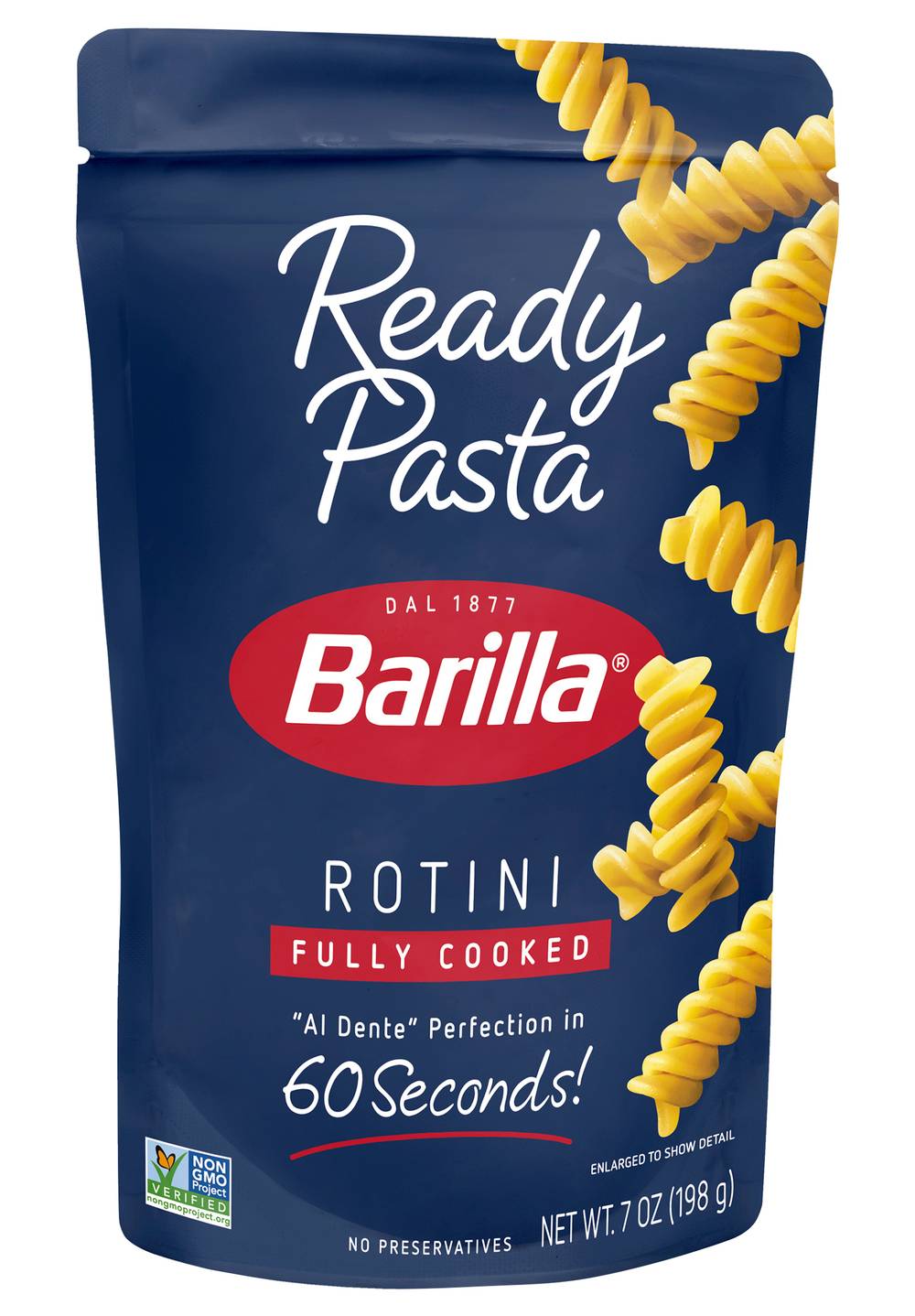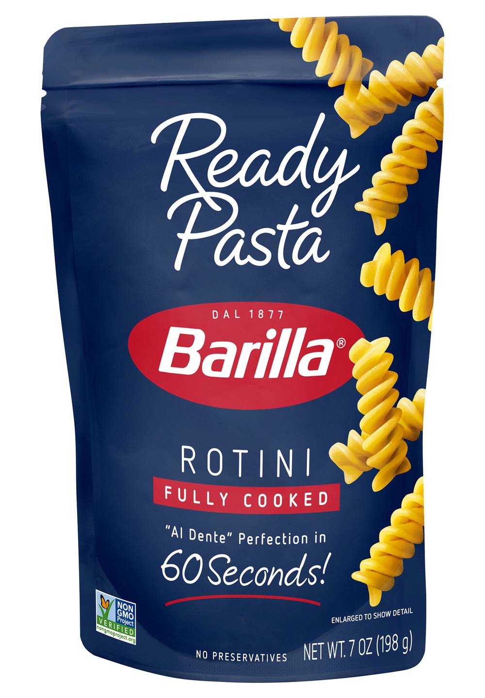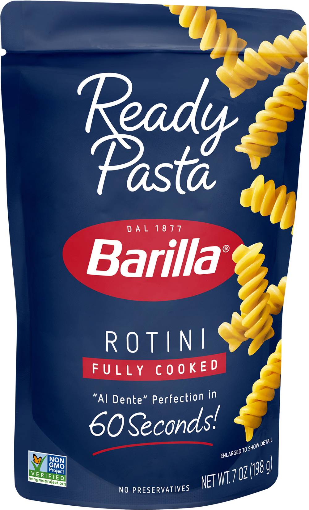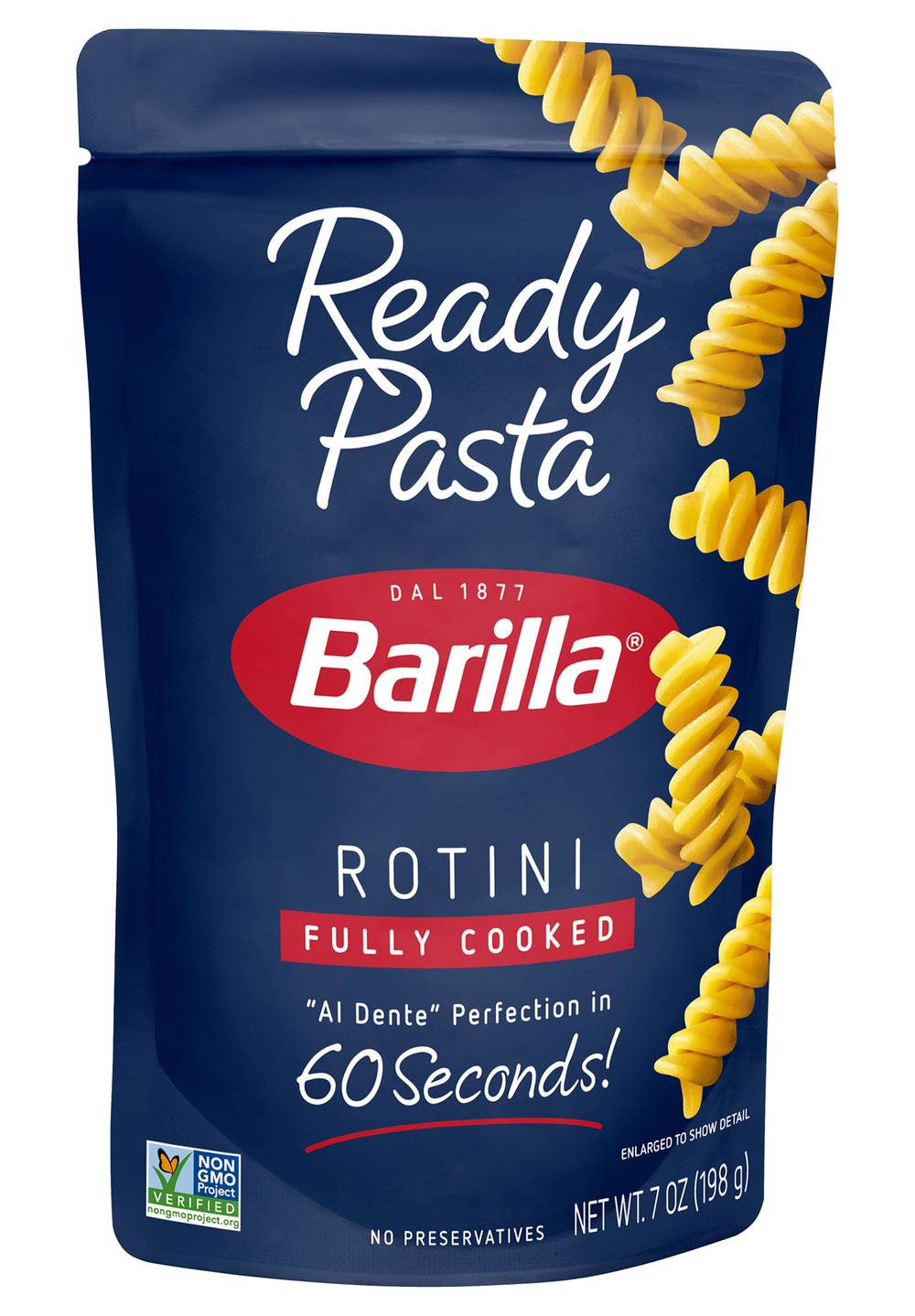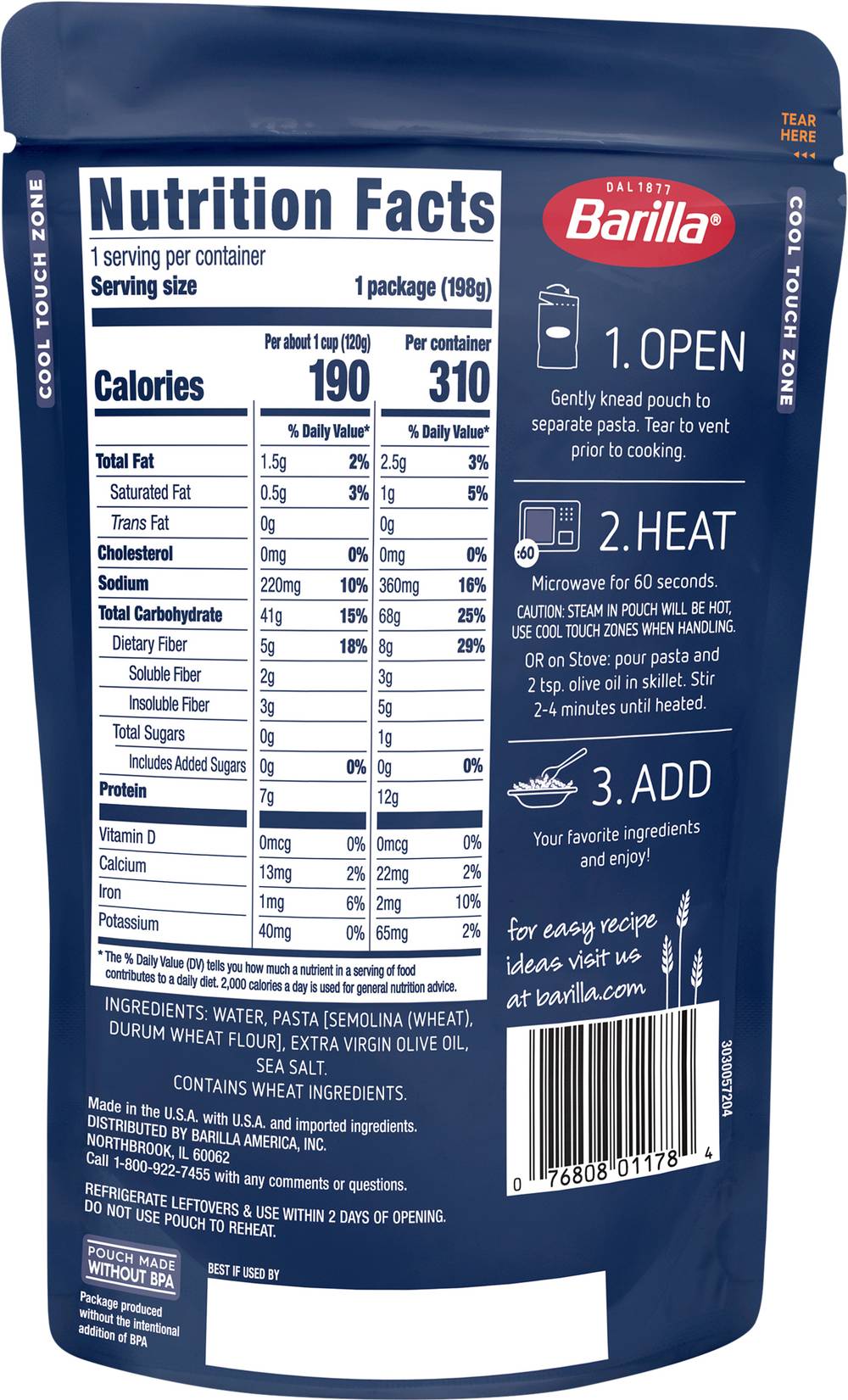 Non-GMO Project verified. nongmoproject.org. Fully cooked. Al Dente perfection in 60 seconds! No preservatives. Cool touch zone. barilla.com. For easy recipe ideas visit us at barilla.com. Call 1-800-922-7455 with any comments or questions. Pouch made without BPA. Package produced without the intentional addition of BPA. Made in the U.S.A. with U.S.A. and imported ingredients. Size: 7 OZ