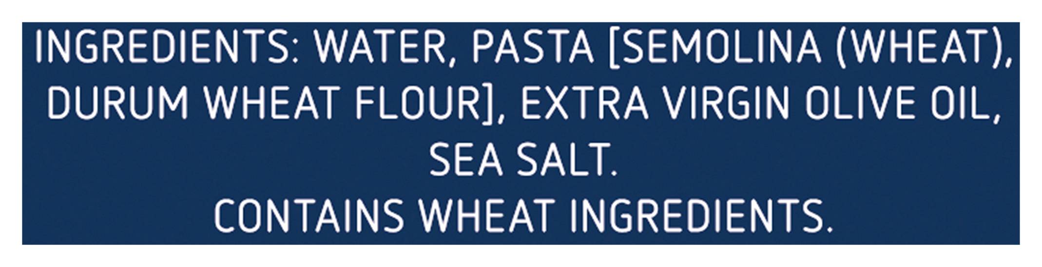Ingredients: Water, Pasta [Semolina (Wheat), Durum Wheat Flour], Extra Virgin Olive Oil, Sea Salt Contains: Wheat