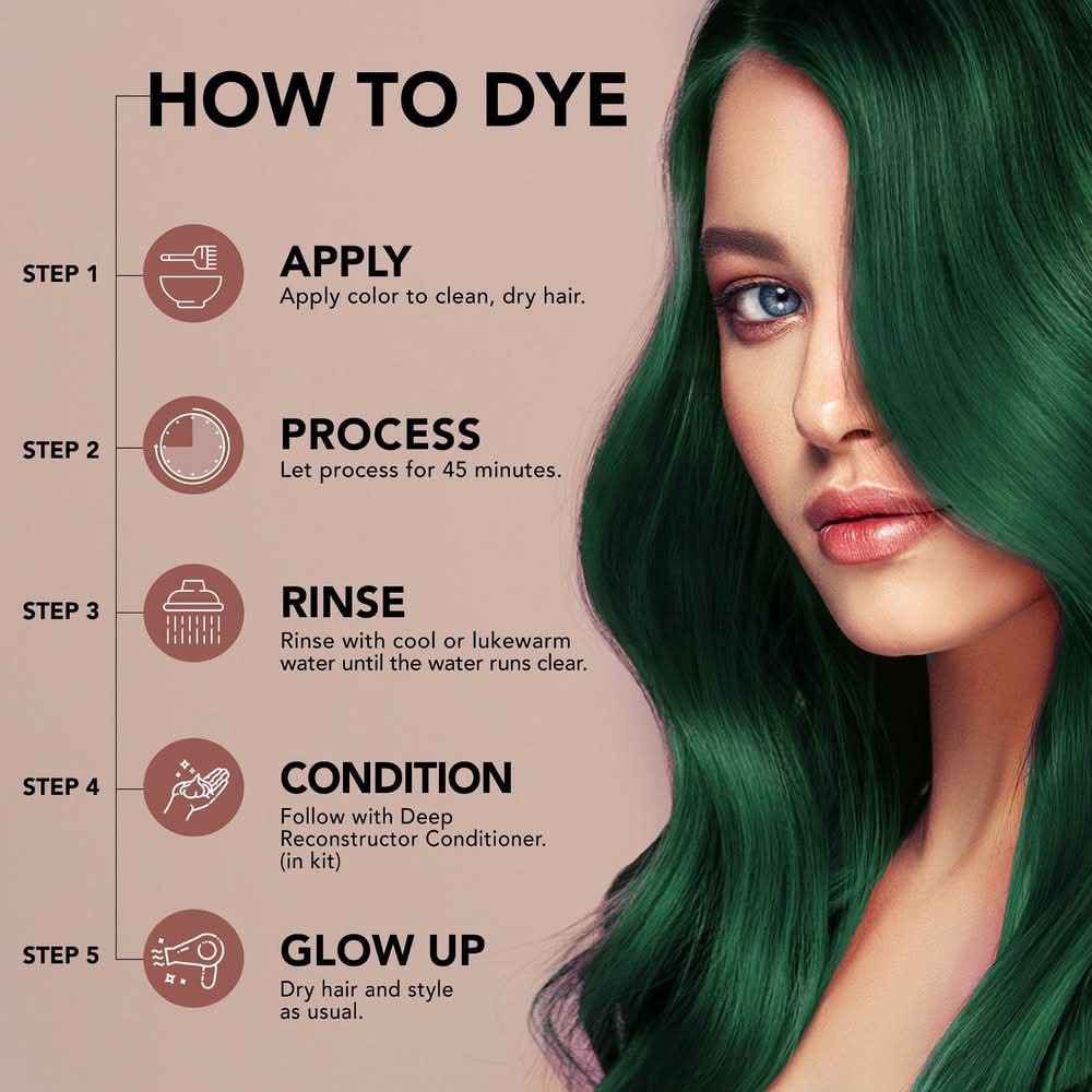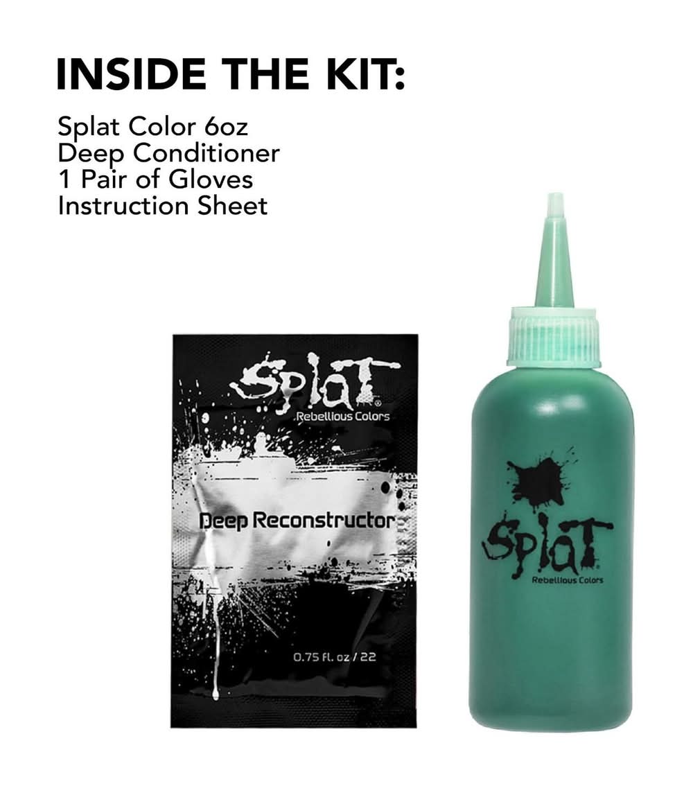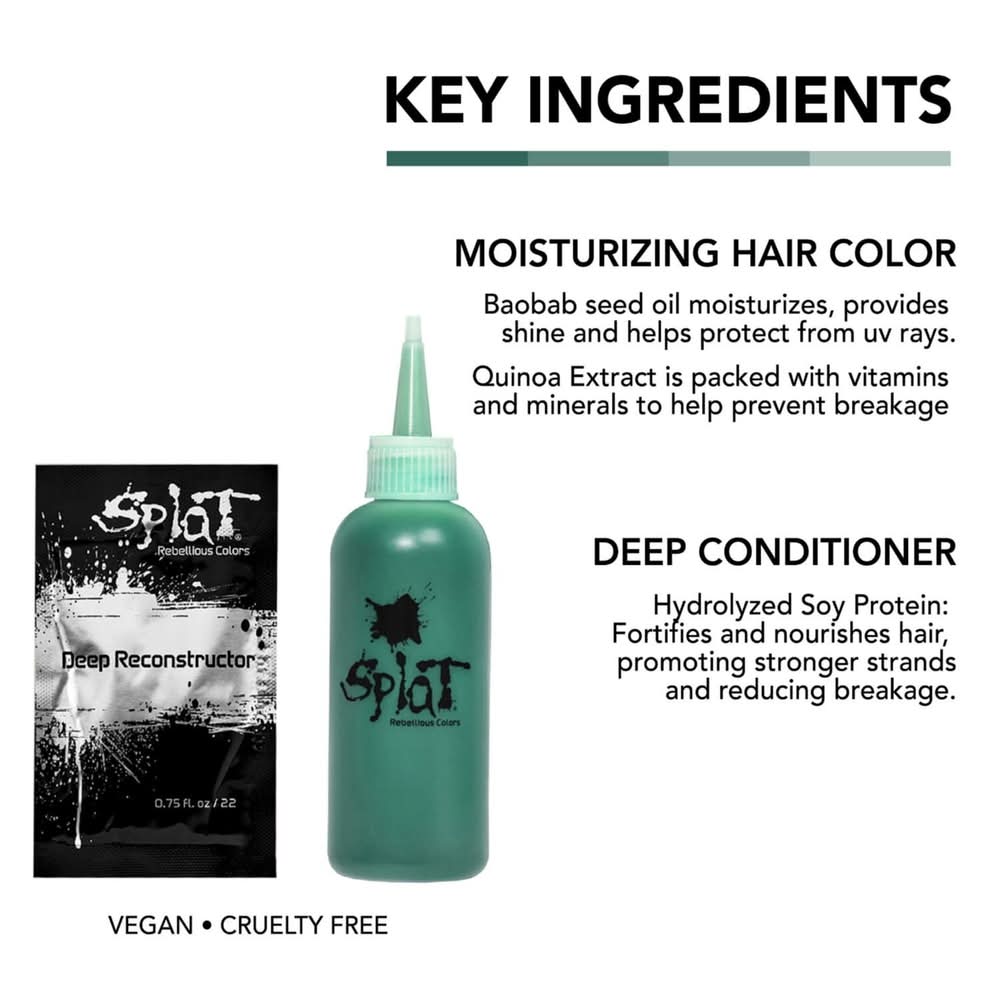 DON'T WANT TO BLEACH? NO PROBLEM Splat Midnight Semi-Permanent Color No Bleach Kit has been specially formulated to make coloring a little easier and less messy. The unique formula conditions your hair while you color and there's no bleach necessary (brunettes, we got you!) - which means the final reveal will be pure lustrous magic through 30 washes. • Kit contains everything needed for one-application • Best for Brunettes • Rich Velvet Color • Conditions while you color • WITH BAOBAB & QUINOA OIL Try all our Splat shades for a beautifully dangerous look. The power of color is in your hands. What color will you pick? Who is Splat? • Splat is manufactured by Developlus Inc. in the USA with headquarters located in Southern California • We're a Cruelty-Free Company! We do not do test on animals! • We're a Women's Owned Certified Business • We're Vegan Certified Splat Product: • Splat is a semi-permanent color that washes out in 20-30 washes • Results will depend on porosity and condition of your hair • Formula contains conditioners and panthenol to improve moisture retention • Specially developed formula for vivid and dramatic colors even on dark shades • *Strand test: We advise that you test a small section of your hair first to determine how long you want to keep your color in. • Video tutorials and hair ideas at: https://www.splathaircolor.com/tutorials/ SPLAT 30 WASH NO BLEACH KIT INCLUDES Everything you need for extremely vivid color! • 6 FL OZ HAIR COLOR • RECONSTRUCTING CONDITIONER • INSTRUCTIONS & GLOVES 2 kits may be needed for very long or thick hair Color: Green