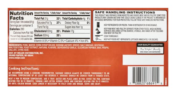 Fresh From Meijer Mild Italian Sausage Links are crafted from lean pork and blended with natural spices, providing a classic Italian flavor profile that makes them a family favorite. These versatile sausages are suitable for both grilling and stovetop cooking, and they can also be a delightful addition to pasta sauces. They are gluten-free and contain no MSG. Flavor: Mild
