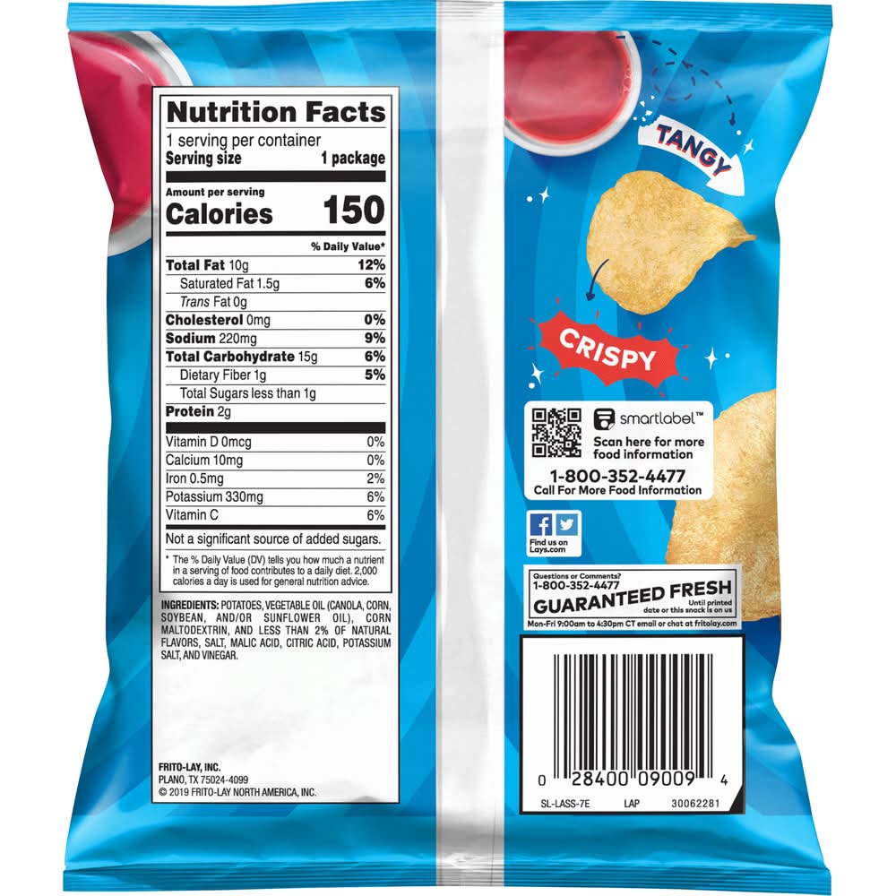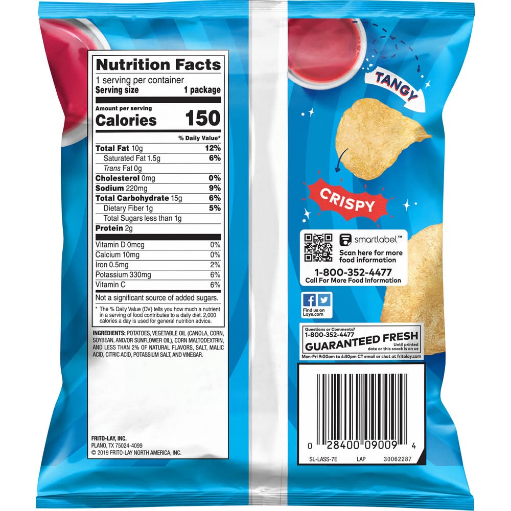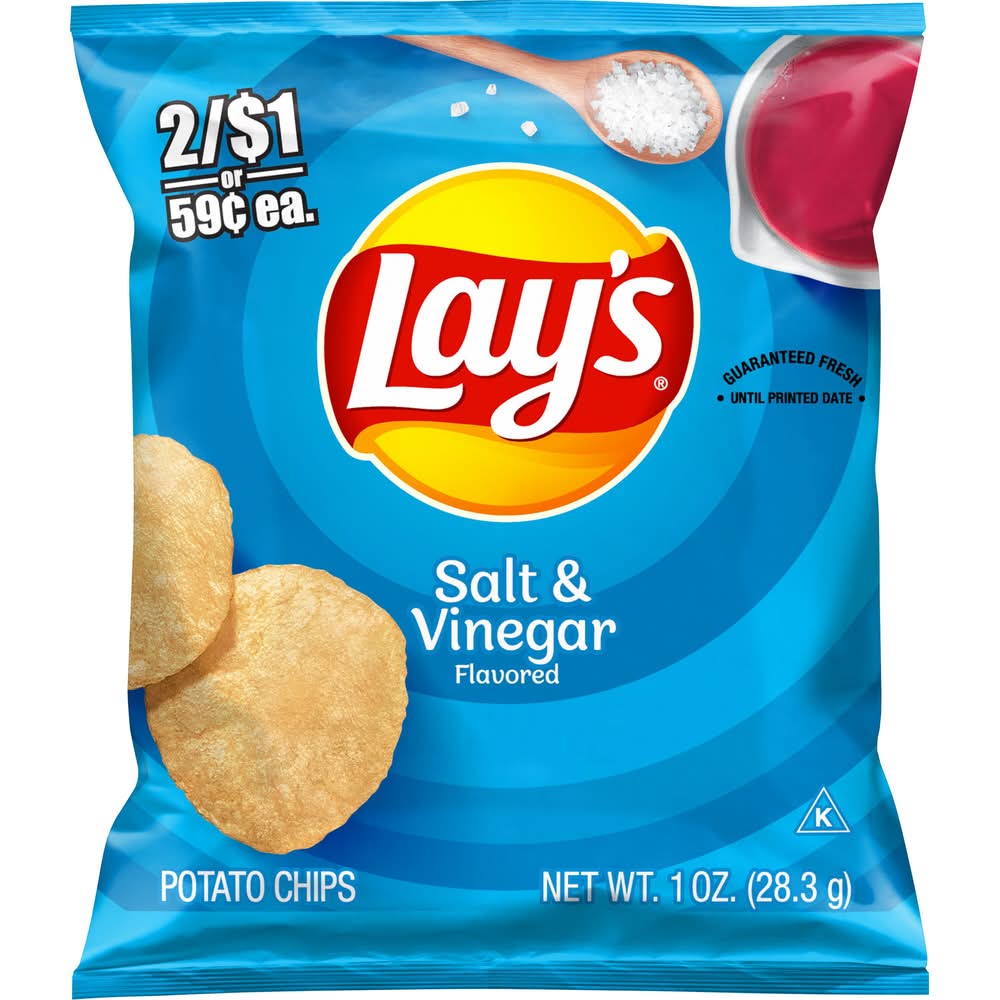 Wherever celebrations and good times happen, the LAY'S brand will be there just as it has been for more than 75 years. With flavors almost as rich as our history, we have a chip or crisp flavor guaranteed to bring a smile on your face. • Flavor: Salt & vinegar • Size: 1 OZ • Frito-lay, inc., Plano,TX,75024-4099