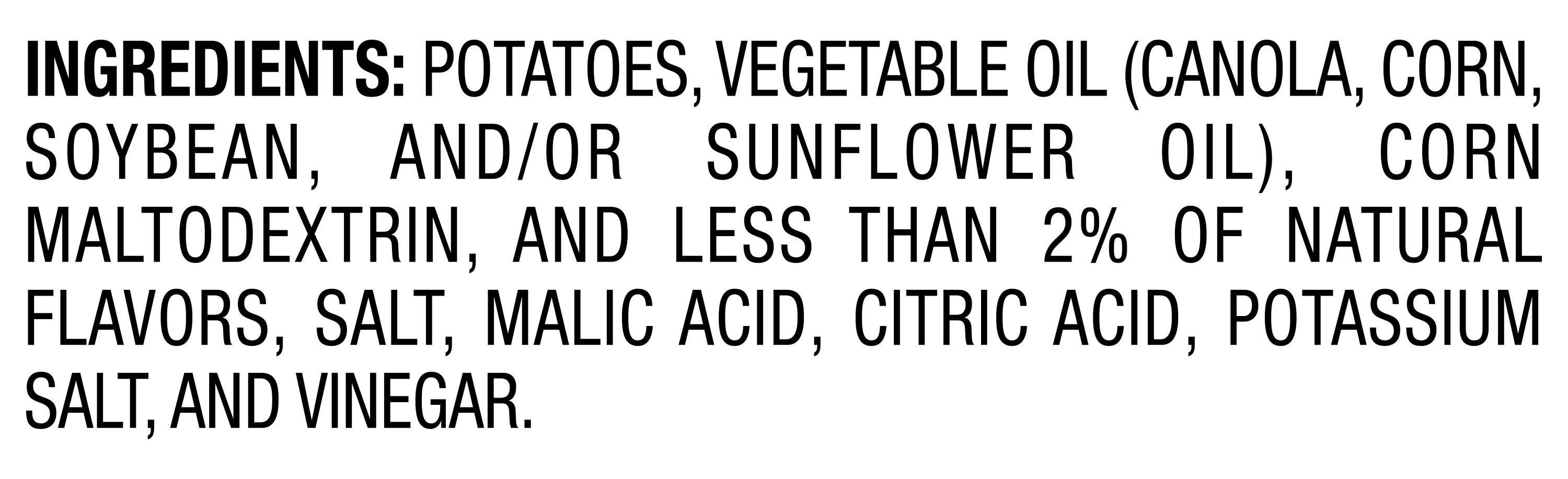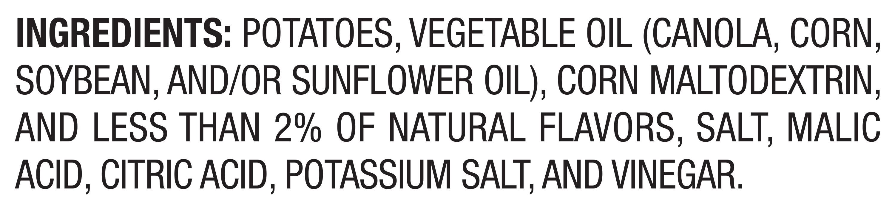 Ingredients: Potatoes, Vegetable Oil (Canola, Corn, Soybean, And/Or Sunflower Oil), Corn Maltodextrin, And Less Than 2% Of Natural Flavors, Salt, Malic Acid, Citric Acid, Potassium Salt, And Vinegar. Contains: Soybeans Additives: Kosher