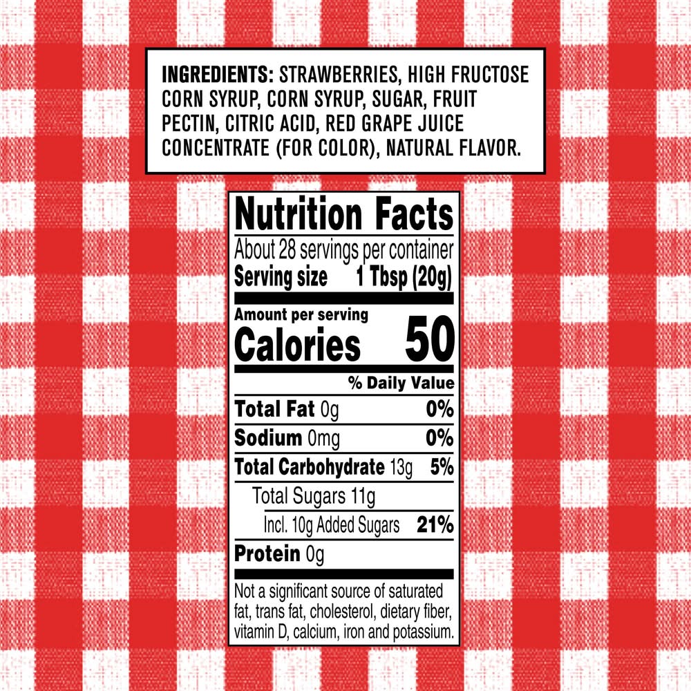 Ingredients: Strawberries, High Fructose Corn Syrup, Corn Syrup, Sugar, Fruit Pectin, Citric Acid, Red Grape Juice Concentrate (for Color), Natural Flavor.