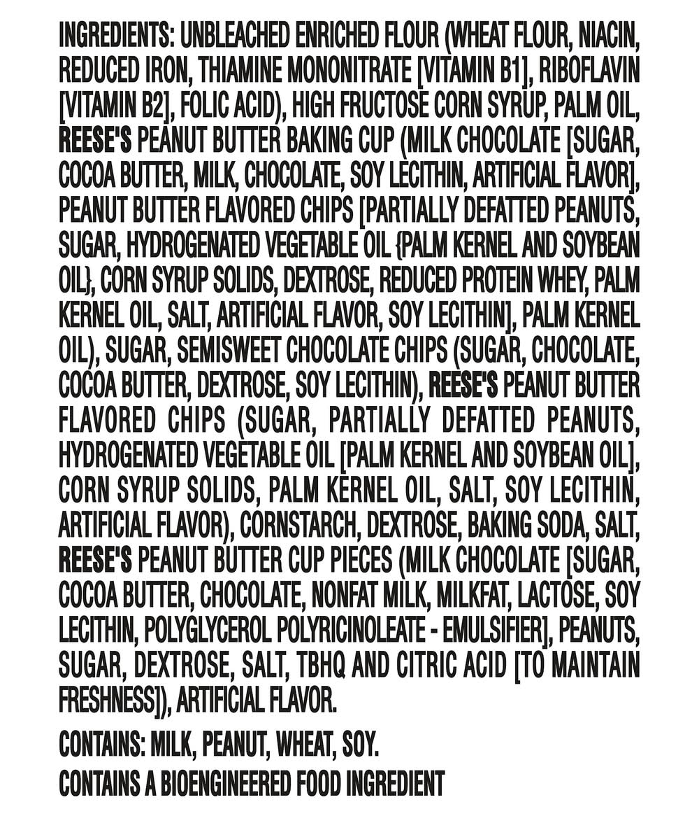 Ingredients: INGREDIENTS: UNBLEACHED ENRICHED FLOUR (WHEAT FLOUR, NIACIN, REDUCED IRON, THIAMINE MONONITRATE [VITAMIN B1], RIBOFLAVIN [VITAMIN B2], FOLIC ACID), HIGH FRUCTOSE CORN SYRUP, PALM OIL, REESE'S PEANUT BUTTER BAKING CUP (MILK CHOCOLATE [SUGAR, COCOA BUTTER, MILK, CHOCOLATE, SOY LECITHIN, ARTIFICIAL FLAVOR], PEANUT BUTTER FLAVORED CHIPS [PARTIALLY DEFATTED PEANUTS, SUGAR, HYDROGENATED VEGETABLE OIL {PALM KERNEL AND SOYBEAN OIL}, CORN SYRUP SOLIDS, DEXTROSE, REDUCED PROTEIN WHEY, PALM KERNEL OIL, SALT, ARTIFICIAL FLAVOR, SOY LECITHIN], PALM KERNEL OIL), SUGAR, SEMISWEET CHOCOLATE CHIPS (SUGAR, CHOCOLATE, COCOA BUTTER, DEXTROSE, SOY LECITHIN), REESE'S PEANUT BUTTER FLAVORED CHIPS (SUGAR, PARTIALLY DEFATTED PEANUTS, HYDROGENATED VEGETABLE OIL [PALM KERNEL AND SOYBEAN OIL], CORN SYRUP SOLIDS, PALM KERNEL OIL, SALT, SOY LECITHIN, ARTIFICIAL FLAVOR), CORNSTARCH, DEXTROSE, BAKING SODA, SALT, REESE'S PEANUT BUTTER CUP PIECES (MILK CHOCOLATE [SUGAR, COCOA BUTTER, CHOCOLATE, NONFAT MILK, MILKFAT, LACTOSE, SOY LECITHIN, POLYGLYCEROL POLYRICINOLEATE - EMULSIFIER], PEANUTS, SUGAR, DEXTROSE, SALT, TBHQ AND CITRIC ACID [TO MAINTAIN FRESHNESS]), ARTIFICIAL FLAVOR. CONTAINS: MILK, PEANUT, WHEAT, SOY. Contains: CONTAINS: MILK, PEANUT, WHEAT, SOY.