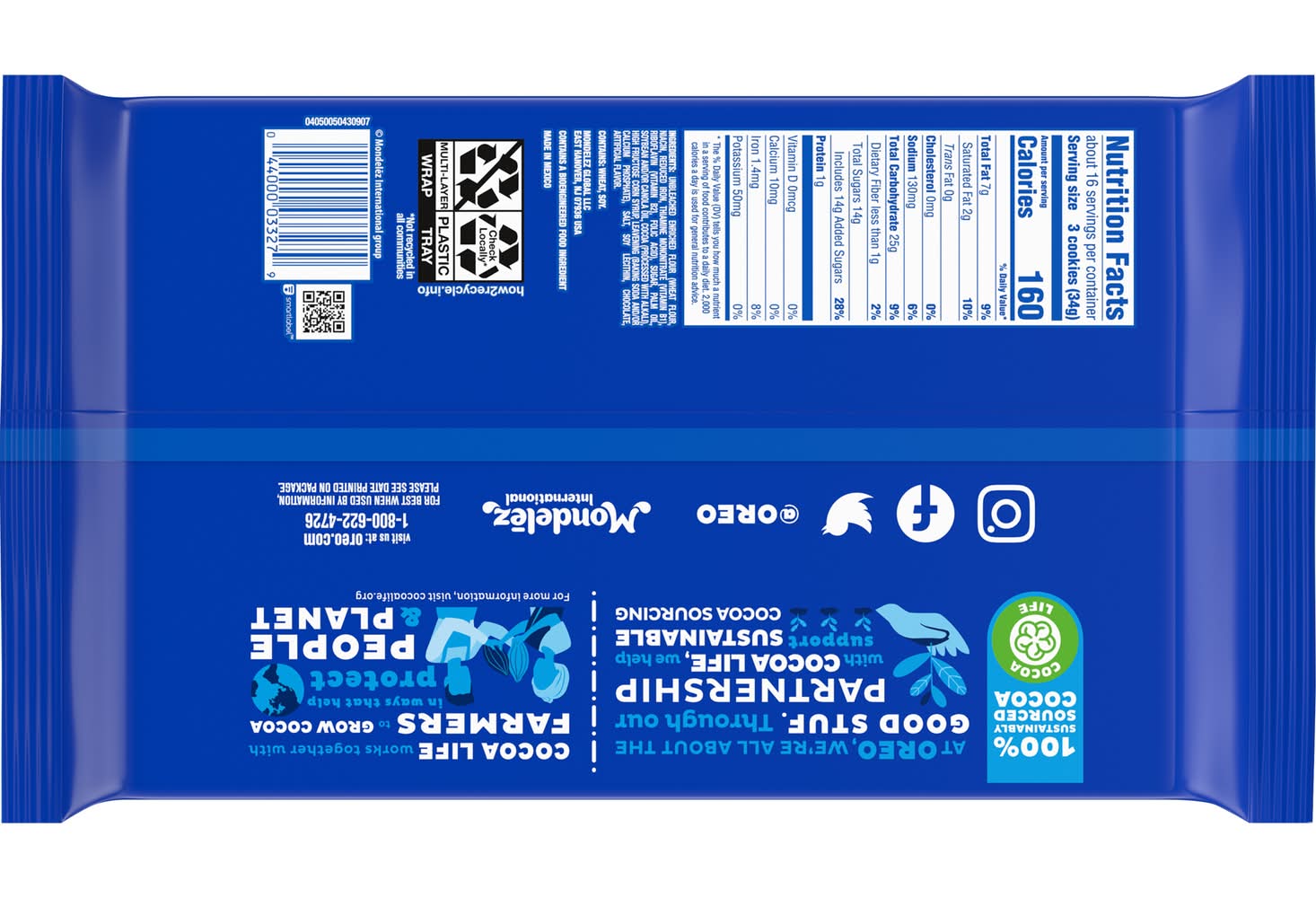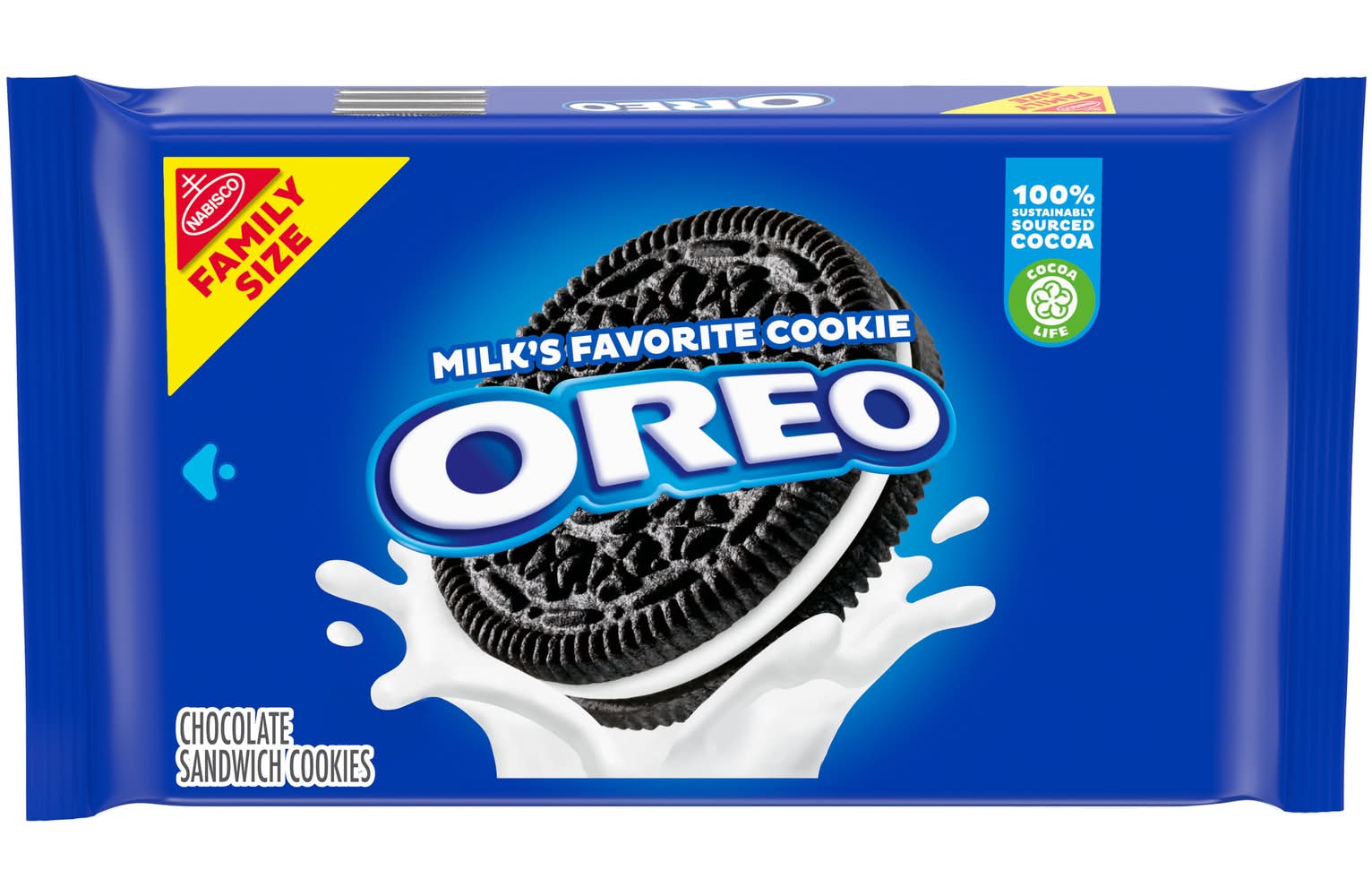 Take a delicious break with OREO Chocolate Sandwich Cookies, America's favorite sandwich cookie for over 100 years. Supremely dunkable, OREO cookies sandwich a rich creme filling between the bold taste of two chocolate wafers--making them milk's favorite cookie. Original OREO chocolate sandwich cookies are great for serving as a dessert or as party snacks at your next gathering or for packing sweet snacks with lunch at school or work. You can even mix these bulk cookies into your favorite dessert recipe for something a little extra special. The resealable OREO packages with easy-pull tab keep chocolate cookies fresh and is great for snacking, sharing, or traveling. Grab a OREO cookies family size package so you're ready for any snacking occasion. Cocoa Life: 100% Sustainably Sourced Cocoa; OREO partners with Cocoa Life to help support sustainable cocoa sourcing. Cocoa life works together with farmers to grow cocoa in ways that help protect people and the planet. • Size: 18.12 OZ • Mondelez Global LLC, East Hanover, Nj, 07936. • Packaging: Reusable