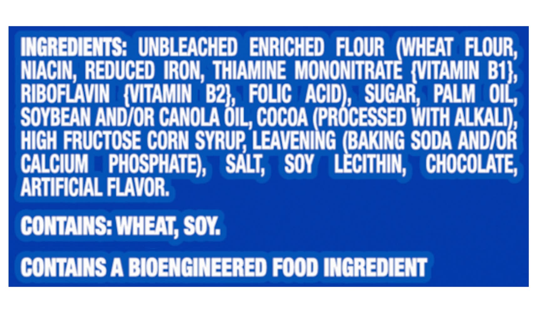 Ingredients: INGREDIENTS: UNBLEACHED ENRICHED FLOUR (WHEAT FLOUR, NIACIN, REDUCED IRON, THIAMINE MONONITRATE {VITAMIN B1}, RIBOFLAVIN {VITAMIN B2}, FOLIC ACID), SUGAR, PALM AND/OR CANOLA OIL, COCOA (PROCESSED WITH ALKALI), HIGH FRUCTOSE CORN SYRUP, LEAVENING (BAKING SODA AND/OR CALCIUM PHOSPHATE), SALT, SOY LECITHIN, CHOCOLATE, ARTIFICIAL FLAVOR. CONTAINS: WHEAT, SOY. Contains: CONTAINS: WHEAT, SOY.