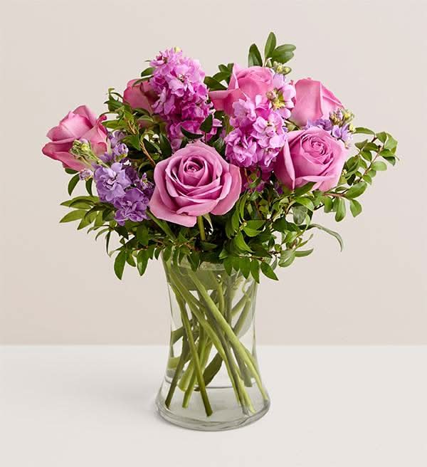 Sweet dreams are made of this: graceful, bountiful, and oh-so-pretty lavender roses blooming amid pink and lavender stock. Carefully arranged by florists for optimal freshness and beauty. Vase included. Essentials Line exclusive.