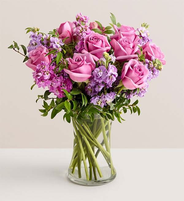 Sweet dreams are made of this: graceful, bountiful, and oh-so-pretty lavender roses blooming amid pink and lavender stock. Carefully arranged by florists for optimal freshness and beauty. Vase included. Essentials Line exclusive.