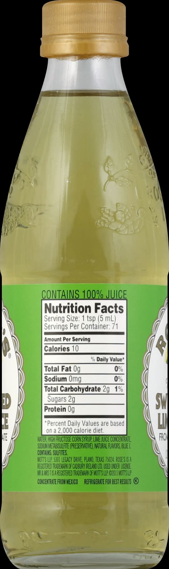 Ingredients: Water High Fructose Corn Syrup Lime Juice Concentrate, Sodium Metabisulfite (Preservative) Natural Flavors Blue 1.