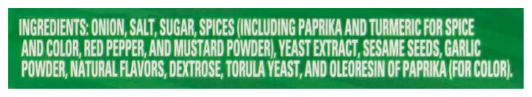 Ingredients: Onion, Salt, Sugar, Spices (Including Paprika and Turmeric for Spice and Color, Red Pepper, and Mustard Powder), Yeast Extract, Sesame Seeds, Garlic Powder, Natural Flavors, Dextrose, Torula Yeast, and Oleoresin of Paprika (for Color)