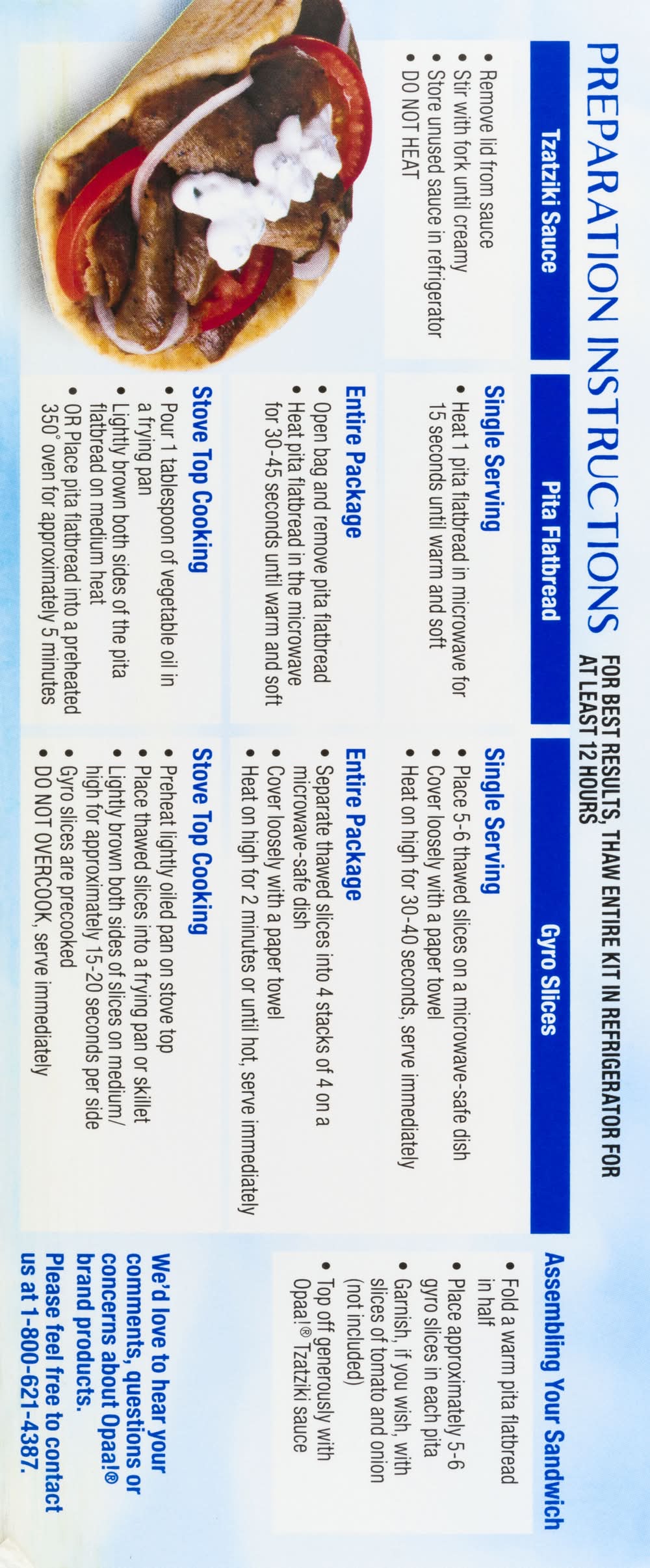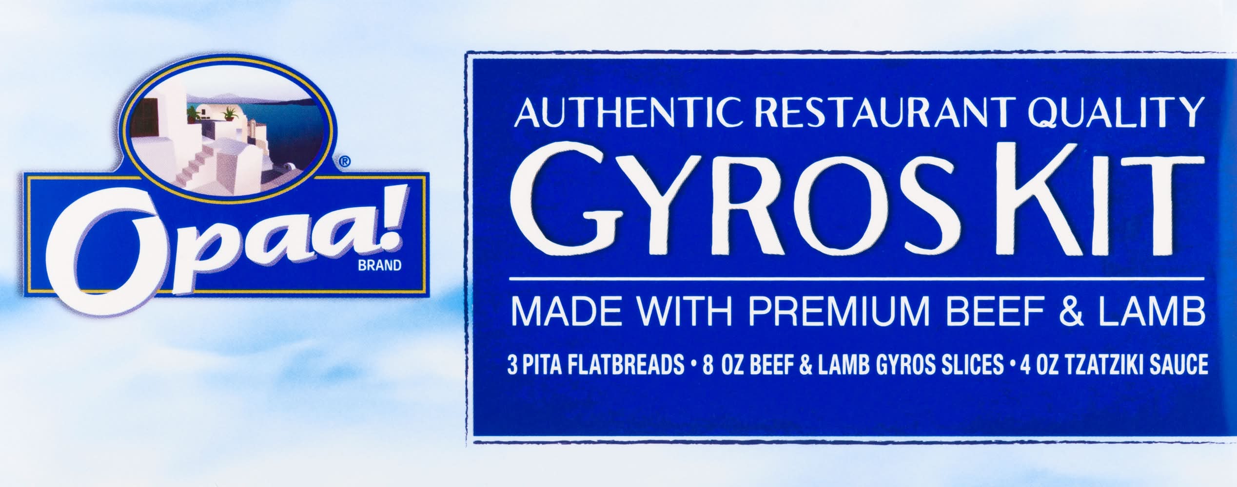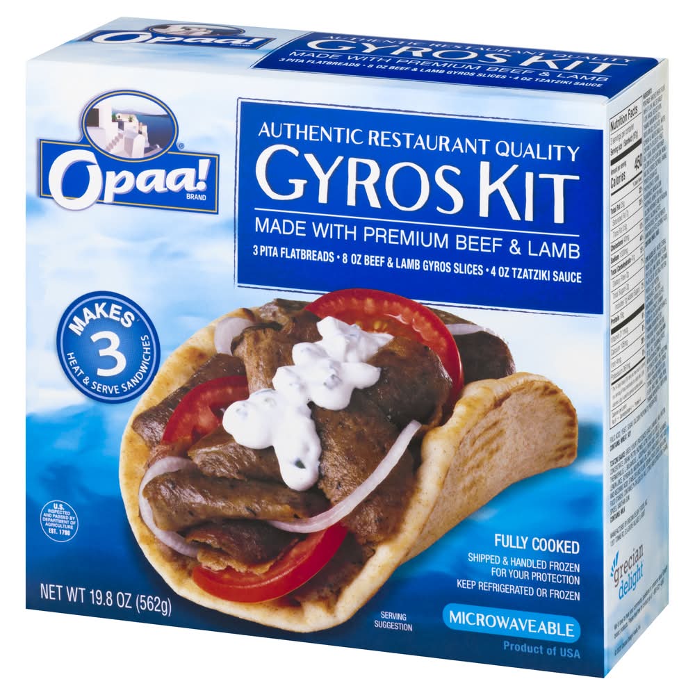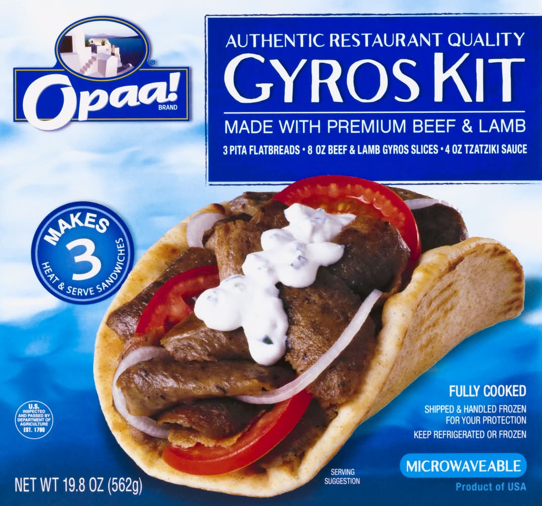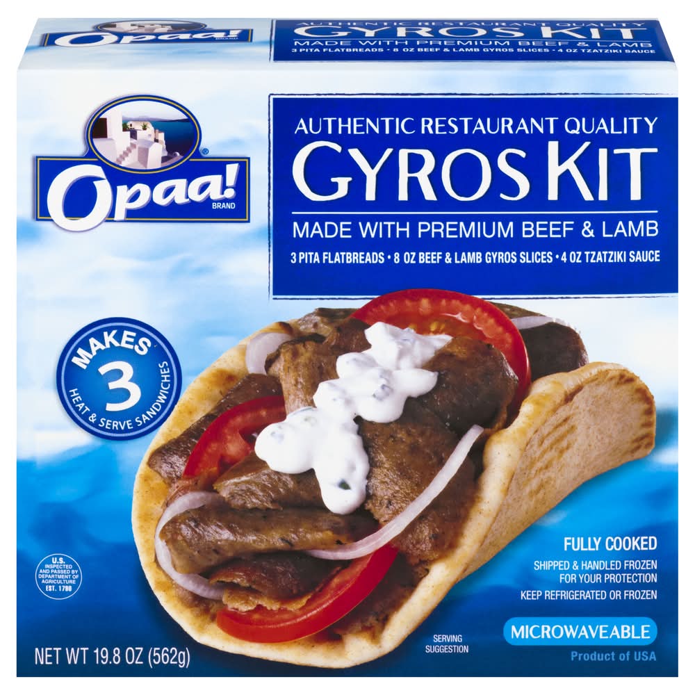 3 pita flatbreads. 8 oz beef & lamb gyros slices. 4 oz tzatziki sauce. Authentic restaurant quality. Made with premium beef & lamb. Makes 3 heat & serve sandwich. U.S. inspected and passed by Department of Agriculture. We'd love to hear your comments, questions or concerns about Opaa! brand product.