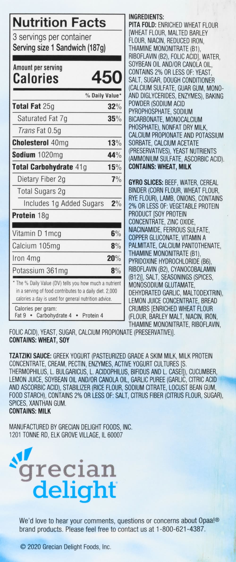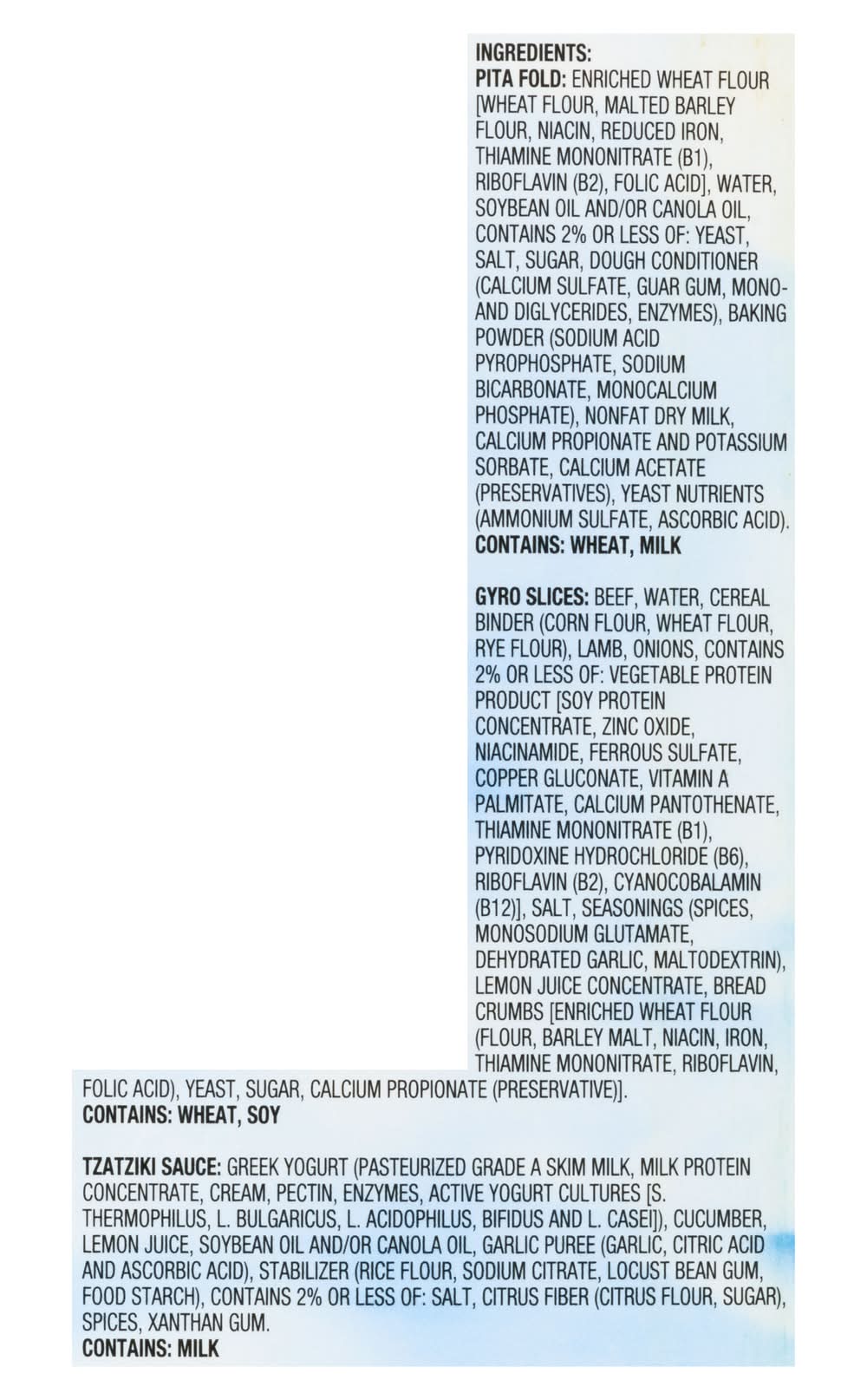 Ingredients: Pita Folic: Enriched Wheat Flour [Wheat Flour, Malted Barley Flour, Niacin, Reduced Iron, Thiamine Mononitrate (B1), Riboflavin (B2), Folic Acid], Water, Soybean Oil and/or Canola Oil, Contains 2% or Less of: Yeast, Salt, Sugar, Dough Conditioner (Calcium Sulfate, Guar Gum, Mono and Diglycerides, Enzymes), Baking Powder (Sodium Acid Pyrophosphate, Sodium Bicarbonate, Monocalcium Phosphate), Nonfat Dry Milk, Calcium Propionate and Potassium Sorbate, Calcium Acetate (Preservatives), Yeast Nutrients (Ammonium Sulfate, Ascorbic Acid). Gyro Slices: Beef, Water, Cereal Binder (Corn Flour, Wheat Flour, Rye Flour), Lamb, Onions, Contains 2% or Less of: Vegetable Protein Product [Soy Protein Concentrate, Zinc Oxide, Niacinamide, Ferrous Sulfate, Copper Gluconate, Vitamin a Palmitate, Calcium Pantothenate, Thiamine Mononitrate (B1), Pyridoxine Hydrochloride (B6), Riboflavin (B2), Cyanocobalamin (B12)], Salt, Seasonings (Spices, Monosodium Glutamate, Dehydrated Garlic, Maltodextrin), Lemon Juice Concentrate, Bread Crumbs [Enriched Wheat Flour (Flour, Barley Malt, Niacin, Iron, Thiamine Mononitrate, Riboflavin, Folic Acid), Yeast, Sugar, Calcium Propionate (Preservative). Tzatziki Sauce: Greek Yogurt (Pasteurized Grade A Skim Milk, Milk Protein Concentrate, Cream, Pectin, Enzymes, Active Yogurt Cultures [S. Thermophilus, L. Bulgaricus, L. Acidophilus, Bifidus and L. Casei), Cucumber, Lemon Juice, Soybean Oil and/or Canola Oil, Garlic Puree (Garlic, Citric Acid and Ascorbic Acid), Stabilizer (Rice Flour, Sodium Citrate, Locust Bean Gum, Food Starch), Contains 2% or Less of: Salt, Citrus Fiber (Citrus Flour, Sugar), Spices, Xanthan Gum Contains: Wheat, Milk, Soybeans