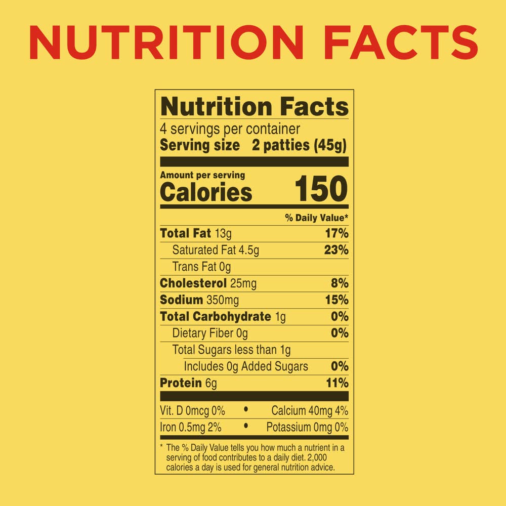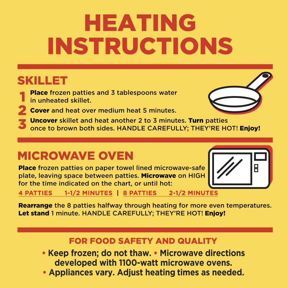 Directions for use: For best results follow heating directions. For Food Safety and Quality: Keep frozen; do not thaw; Microwave directions developed with 1100-watt microwave ovens; Appliances vary. Adjust heating times as needed. Skillet: (1) Place frozen patties and 3 tablespoons water in unheated skillet.( 2) Cover and heat over medium heat 5 minutes.(3) Uncover skillet and heat another 2 to 3 minutes. Turn Patties once brown both sides. Handle carefully; they're hot! Serve and enjoy! Microwave Oven: For best results, skillet is recommended. Place 4 frozen patties on paper towel lined microwave-safe plate. Microwave on high 1-1/2 minutes. Let stand 1 minute. Handle carefully; they're hot! Enjoy! Keep frozen, microwavable. After opening, keep frozen. Push here and tear to open. Storage recommendation: Keep frozen, microwavable. After opening.