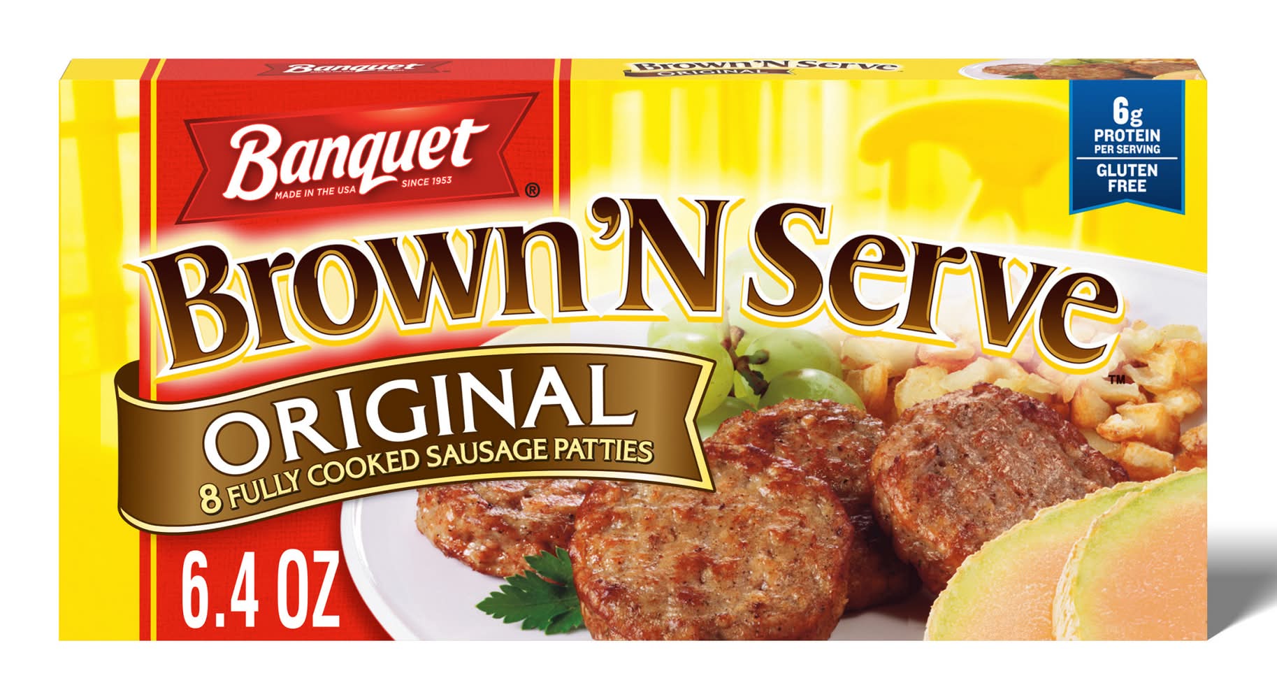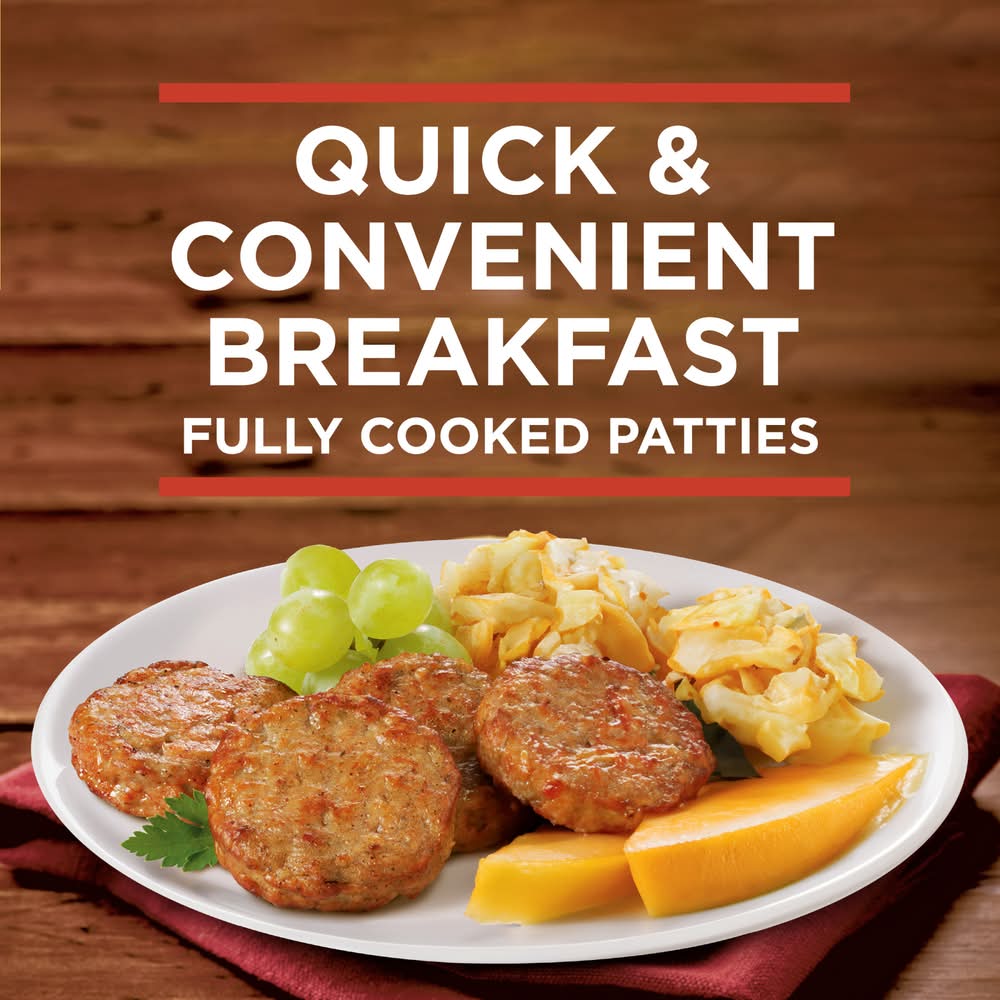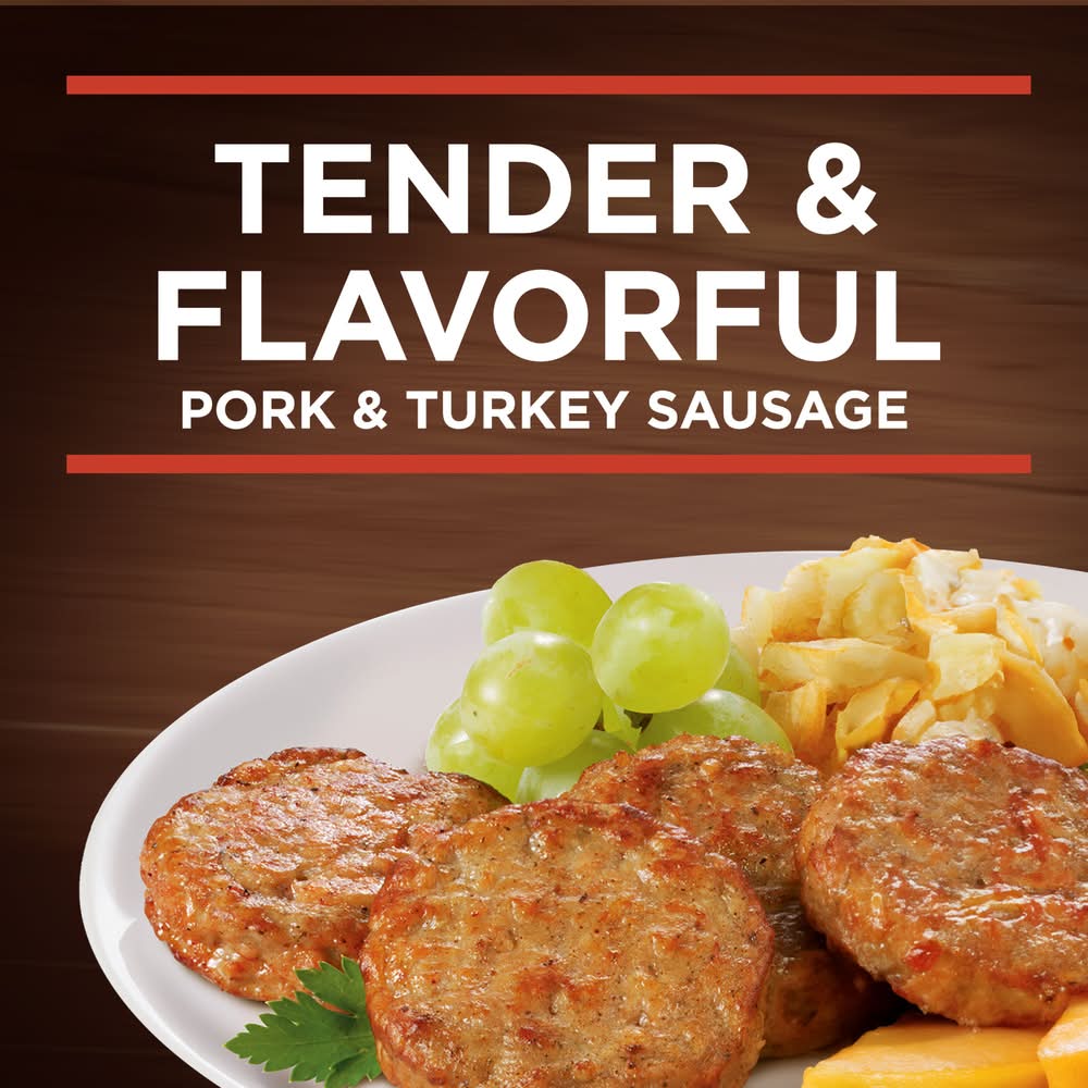 Banquet Brown 'N Serve Original Fully Cooked Sausage Patties Frozen Meat offers an easy way to treat yourself and family to a hearty frozen breakfast side. These precooked breakfast sausage patties are made with pork, turkey and a special blend of spices and seasonings. Banquet Brown 'N Serve Original Sausage is gluten free and has 5 grams of protein per serving. Enjoy ground pork and turkey sausage patties as part of a hot and hearty breakfast that will please the whole family. With the commotion of getting ready for work and school, these breakfast sausages take away the headache of what to eat for breakfast on a hectic morning. Prepare the frozen sausages in a skillet for that fresh, out of the pan taste, or in a microwave for quicker cook time. Keep the 8 pack in the freezer until ready to prepare. For over 60 years, Banquet has been making delicious food the whole family loves.