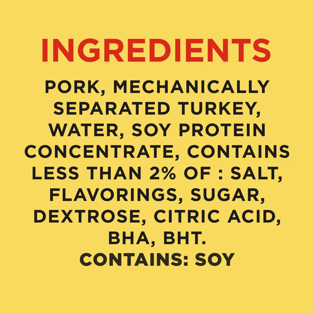 Ingredients: Pork, Mechanically Separated Turkey, Water, Soy Protein Concentrate, Contains less than 2% of: Salt, Flavorings, Sugar, Dextrose, Citric Acid, BHA, BHT._x000D_ CONTAINS: SOY. Contains: Soy