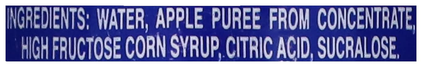 Ingredients: Water, Apple Puree from Concentrate, High Fructose Corn Syrup, Citric Acid, Sucralose