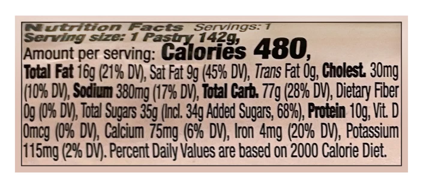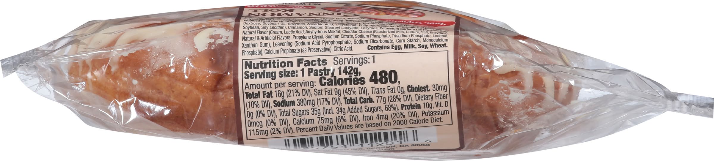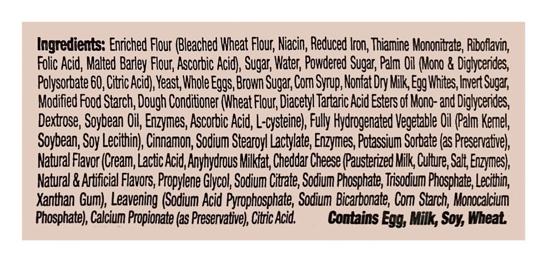 Ingredients: Enriched Flour (Bleached Wheat Flour, Niacin, Reduced Iron, Thiamine Mononitrate, Riboflavin, Folic Acid, Malted Barley Flour, Ascorbic Acid), Sugar, Water, Powdered Sugar, Palm Oil (Mono & Diglycerides, Polysorbate 60, Citric Acid), Yeast, Whole Eggs, Brown Sugar, Corn Syrup, Nonfat Dry Milk, Egg Whites, Invert Sugar, Modified Food Starch, Dough Conditioner (Wheat Flour, Diacetyl Tartaric Acid Esters of Mono- and Diglycerides, Dextrose, Soybean Oil, Enzymes, Ascorbic Acid, L-Cysteine), Fully Hydrogenated Vegetable Oil (Palm Kernel, Soybean, Soy Lecithin), Cinnamon, Sodium Stearoyl Lactylate, Enzymes, Potassium Sorbate (as Preservative), Natural Flavor (Cream, Lactic Acid, Anyhydrous Milkfat, Cheddar Cheese (Pausterized Milk, Culture, Salt, Enzymes), Natural & Artificial Flavors, Propylene Glycol, Sodium Citrate, Sodium Phosphate, Trisodium Phosphate, Lecithin, Xanthan Gum), Leavening (Sodium Acid Pyrophosphate, Sodium Bicarbonate, Corn Starch, Monocalcium Phosphate), Calcium Propionate (as Preservative), Citric Acid Contains: Eggs, Milk, Soybeans, Wheat, Barley, Corn