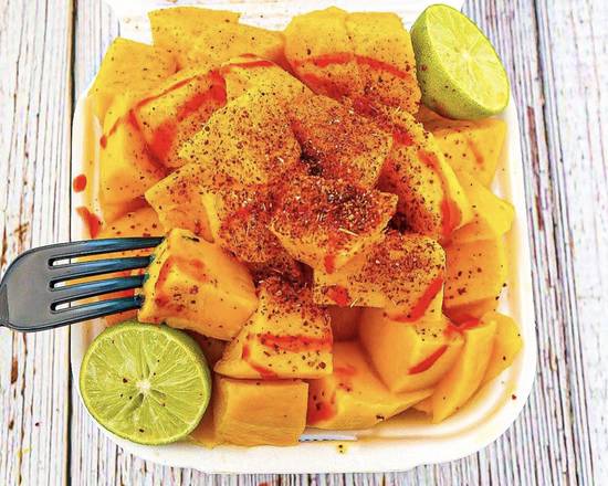 1 semi ripened bag of mangoes prepared with hot sauce, salt, and a wedge of lime.