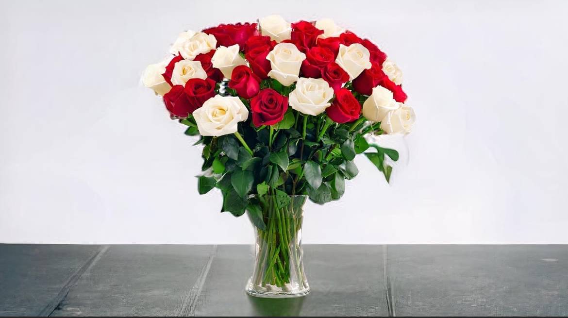 This stunning arrangement features two dozen roses in a classic blend of white and red, creating a striking contrast that exudes elegance and sophistication. The pure white roses symbolize respect and admiration, while the rich red roses evoke passion and warmth, making this combination both timeless and impactful. Arranged thoughtfully, each rose stands tall with lush, dark green leaves filling in the gaps, giving the arrangement a full, abundant appearance. Perfect as a romantic gesture or a bold centerpiece, this white and red rose arrangement brings a sense of beauty and balance to any setting, captivating all who see it.
