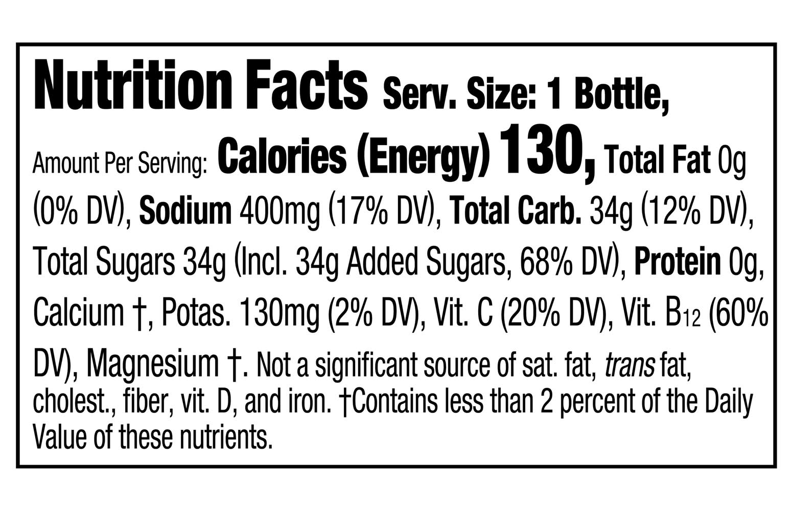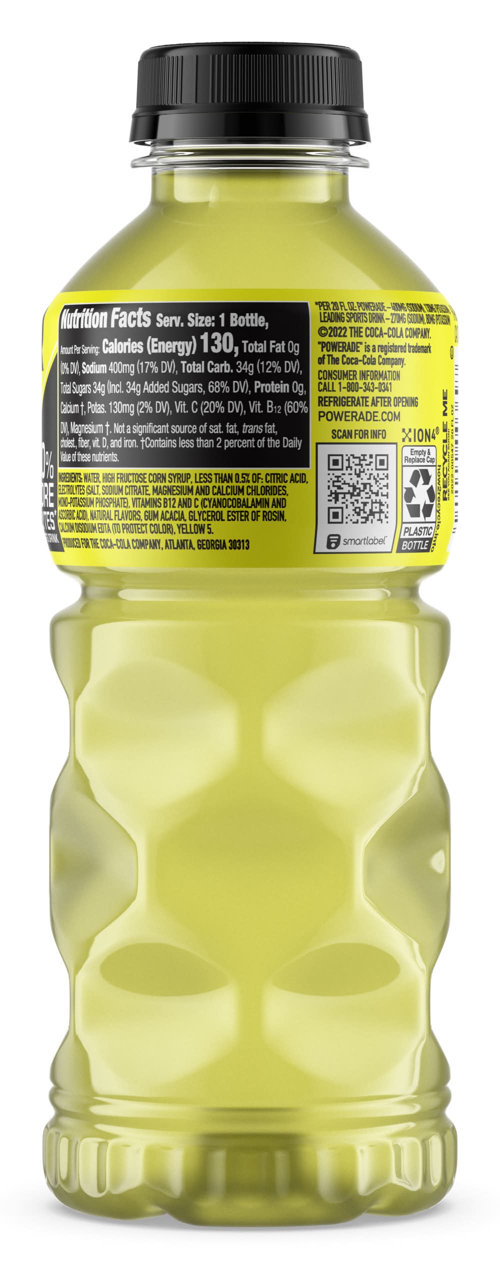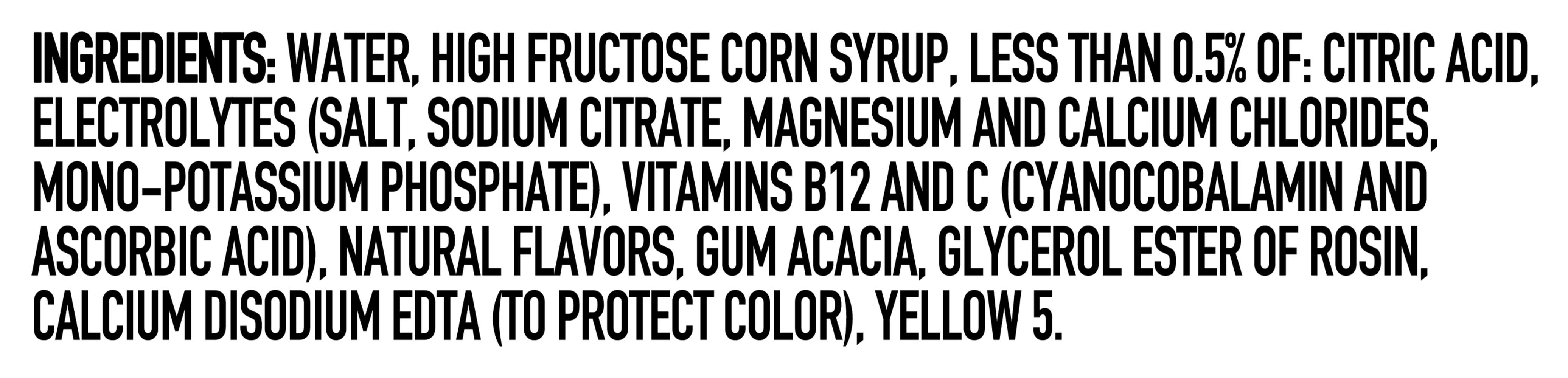 Ingredients: Water, High Fructose Corn Syrup, Less Than 0.5% Of: Citric Acid, Electrolytes (Salt, Mono-Potassium Phosphate, Magnesium And Calcium Chlorides), Gum Acacia, Natural Flavors, Glycerol Ester Of Rosin, Vitamins B3, B6, B12 (Niacinamide, Pyridoxine Hydrochloride, Cyanocobalamin), Yellow 5, Ascorbic Acid (To Protect Taste), Calcium Disodium Edta (To Protect Color). Contains: Corn