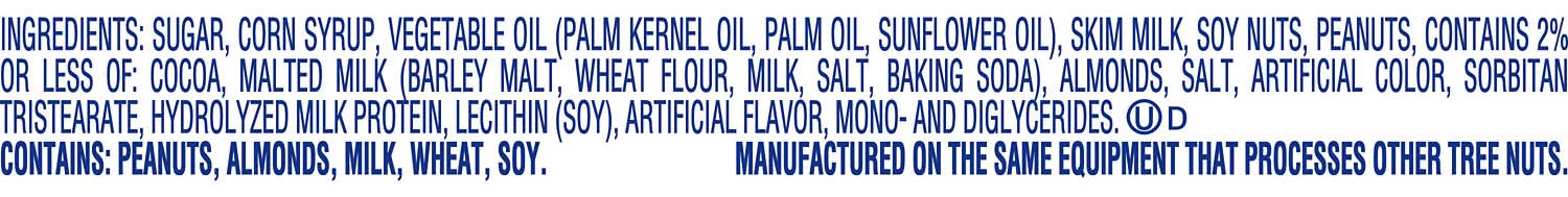 Ingredients: Sugar, Corn Syrup, Vegetable Oil Palm Kernel Oil, Palm Oil, Sunflower Oil, Nonfat Milk, Soy Pieces, Peanuts, Contains 2% or Less of: Cocoa, Malted Milk Barley Malt Extract, Wheat Flour, Milk, Salt, Sodium Bicarbonate, Almonds, Salt, Artificial Color, Sorbitan Tristearate, Egg Whites, Lecithin Soy, Hydrolyzed Soy Protein, Artificial Flavor, Mono-and Diglycerides. Contains: Milk, Eggs, Peanuts, Tree Nuts, Soybeans, Wheat
