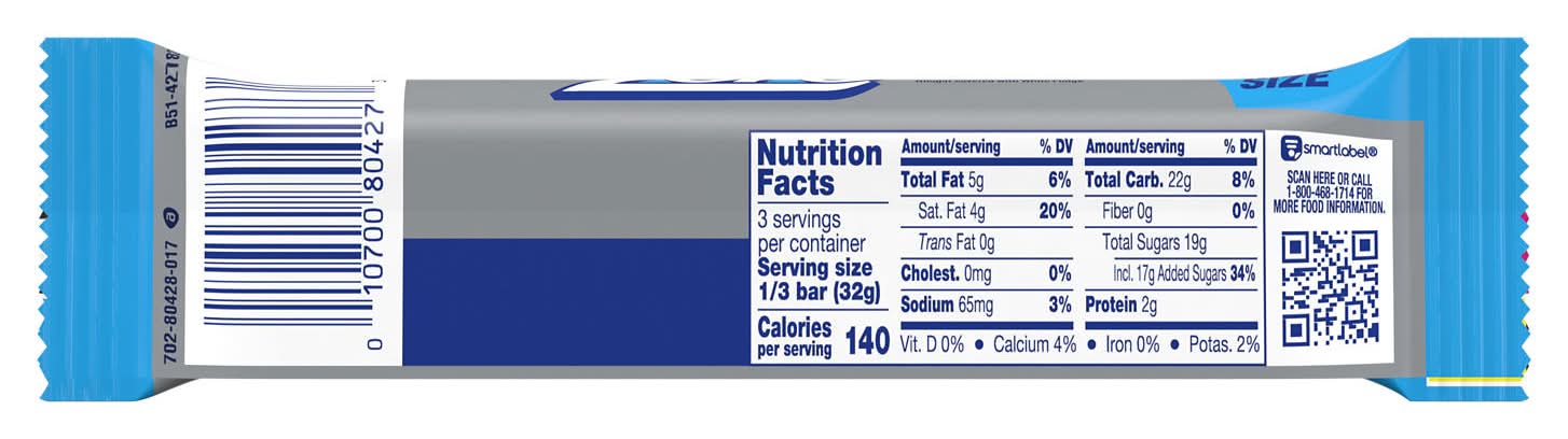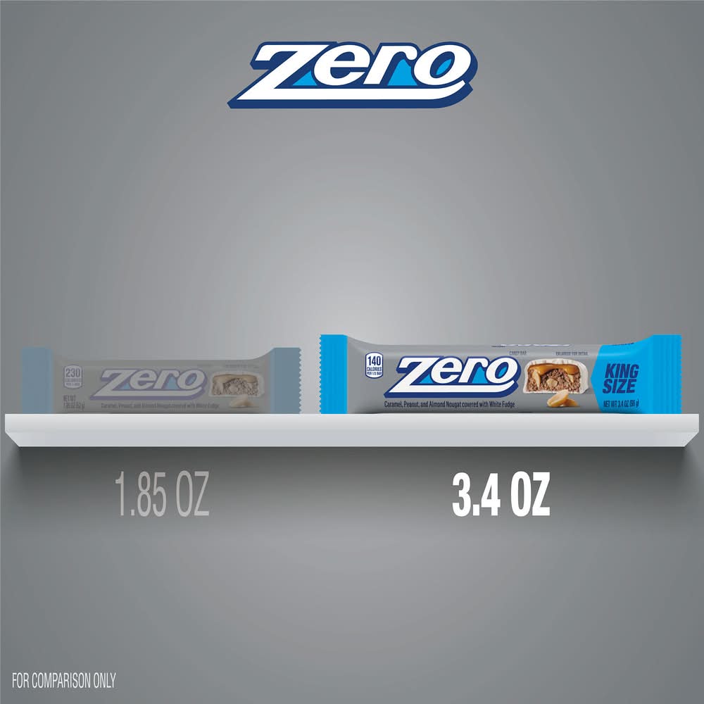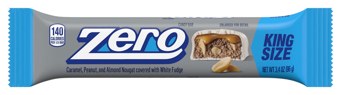 Watch your worries drop to zero after the first bite of this delicious king size candy bar! No, this delicious treat wasn't the handy work of extraterrestrials. Although it might look like an otherworldly candy bar, ZERO features white fudge, caramel, peanut and almond nougat. Grab one as a dessert after dinner, pack one in your lunch box, take a few for your road trip, and keep a few bars handy for movie night or stocked in your pantry for baking and snacking. ZERO is an out-of-this-world kosher candy bar that delivers an unforgettable taste of creamy caramel, crunchy peanuts and tasty almonds all covered in white fudge. These individually wrapped kosher candies can even help entertain your party guests no matter the occasion and are fun to share with your favorite people. Need help enhancing classic baked goods? If you're feeling creative in the kitchen, break apart a ZERO candy bar and add it to your brownies, cupcakes and cookies for an unreal combination that will make its mark, dubbing it part of your new favorite recipes. Want to elevate your holiday gifting? Add these tasty treats to your Valentine's Day and Easter gift baskets, Halloween candy bowls or Christmas stockings and dessert tables to give everyone a unique blast of flavors. • Brand: Zero • Hershey Foods, Hershey, PA 17033-0815 USA