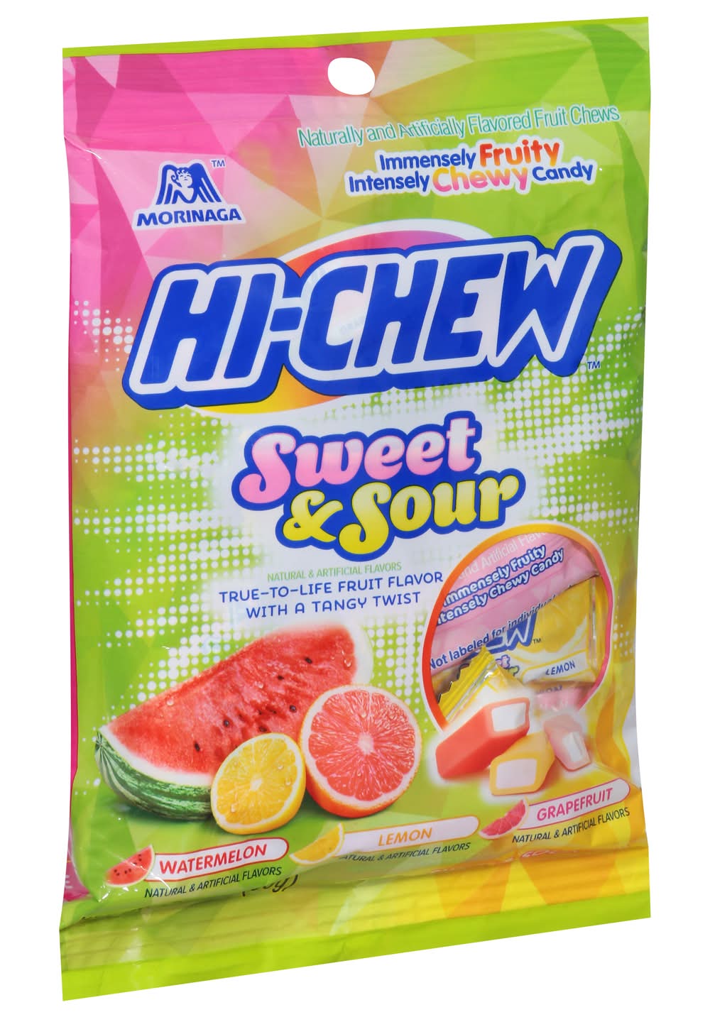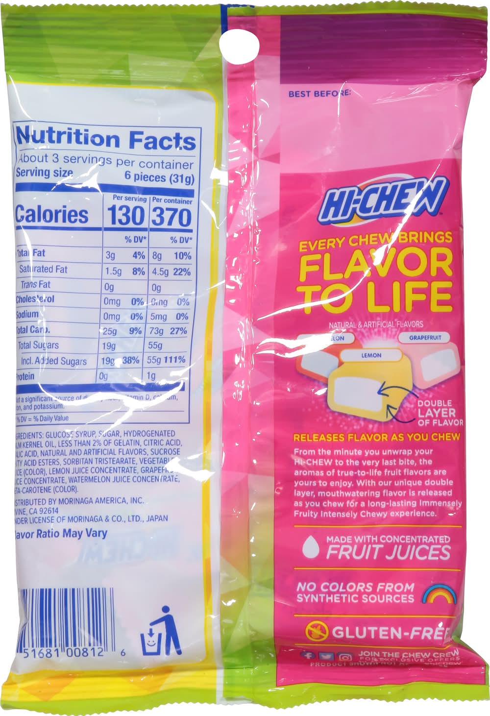 True-to-life fruit flavor with a tangy twist. every chew brings flavor to life. double layer of flavor. release flavor as you chew: from the minute you unwrap your hi-chew to the very last bite, the aromas of true-to-life fruit flavors are yours to enjoy. with our unique double layer, mouthwatering flavor is released as you chew for a long-lasting immensely fruit intensely chewy experience. no colors from synthetic sources. flavor ratio may vary. • Brand: Hi-chew • Flavor: Watermelon lemon grapefruit • gluten-free