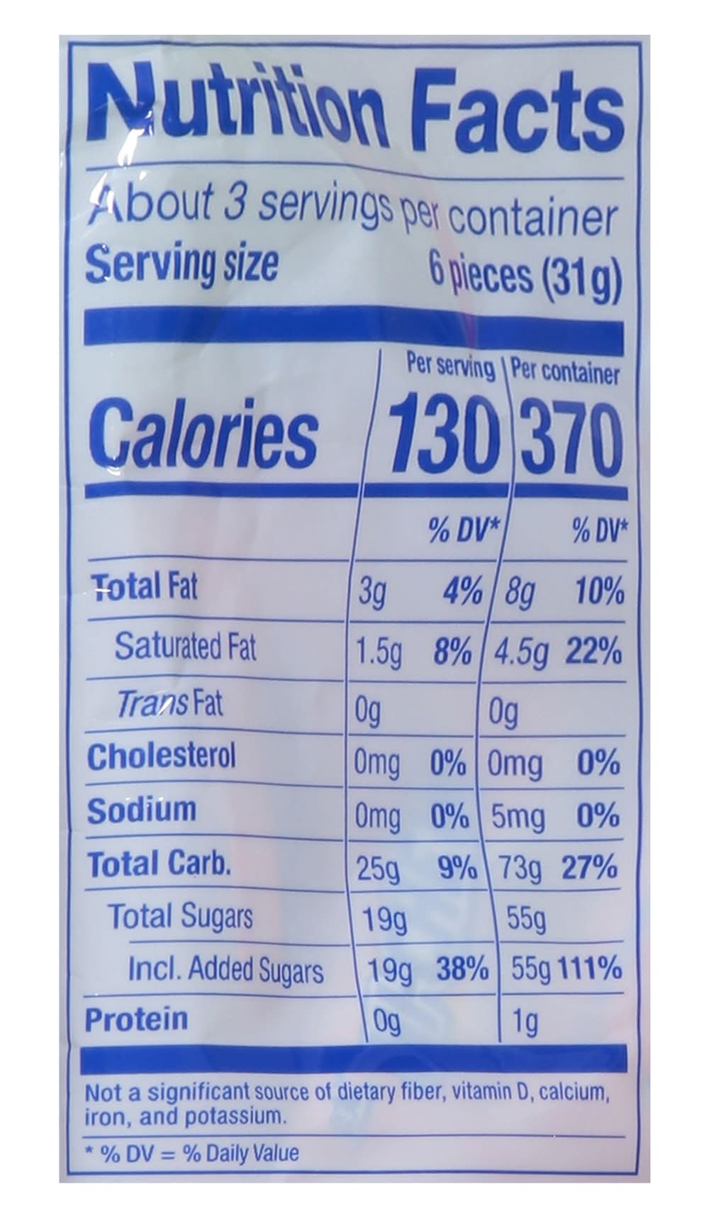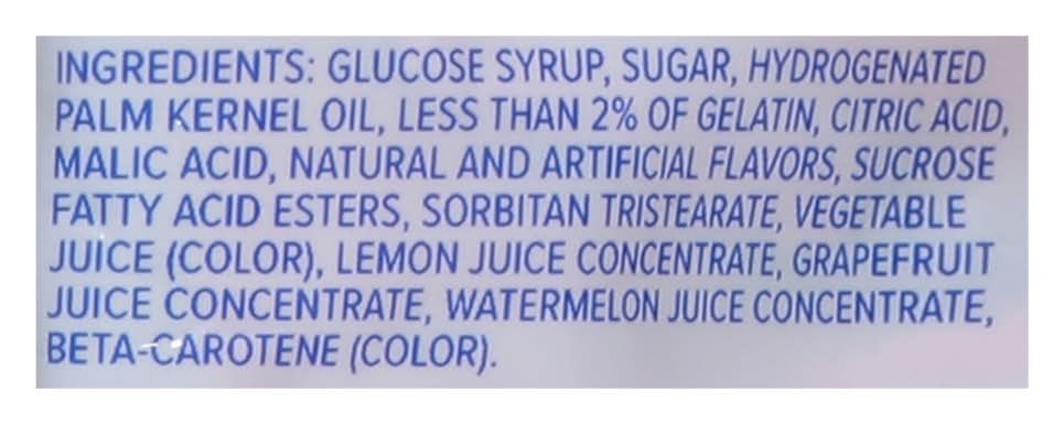 Ingredients: Glucose Syrup, Sugar, Hydrogenated Palm Kernel Oil, Less than 2% of Gelatin, Citric Acid, Malic Acid, Natural and Artificial Flavors, Sucrose Fatty Acid Esters, Sorbitan Tristearate, Vegetable Juice (Color), Lemon Juice Concentrate, Grapefruit Juice Concentrate, Watermelon Juice Concentrate, Beta-Carotene (Color)