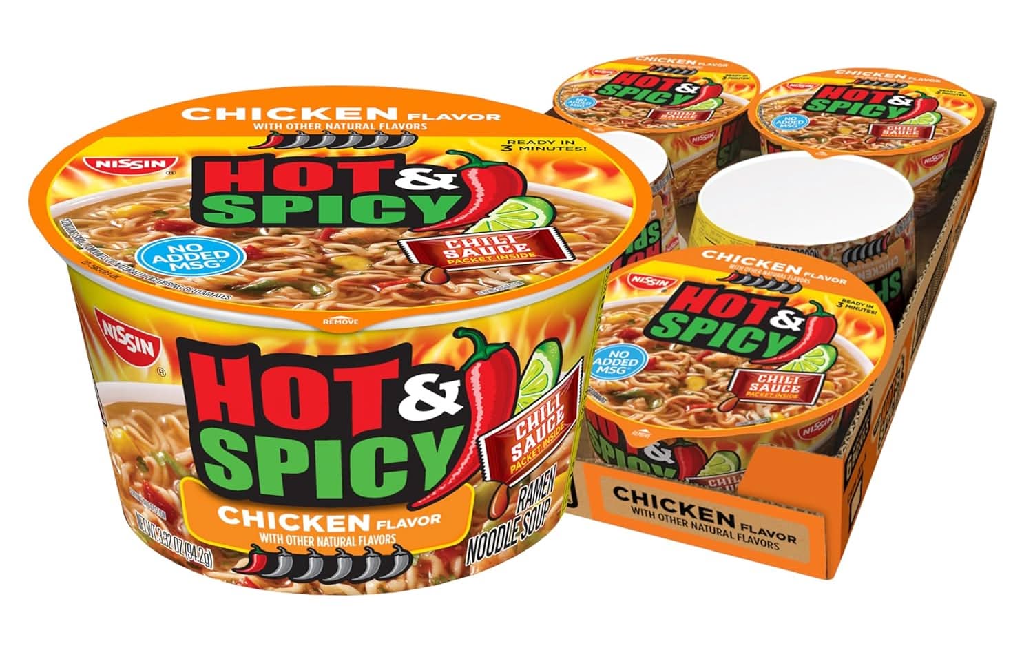Nissin Hot & Spicy Ramen Noodle Soup, Chicken, 3.32 oz