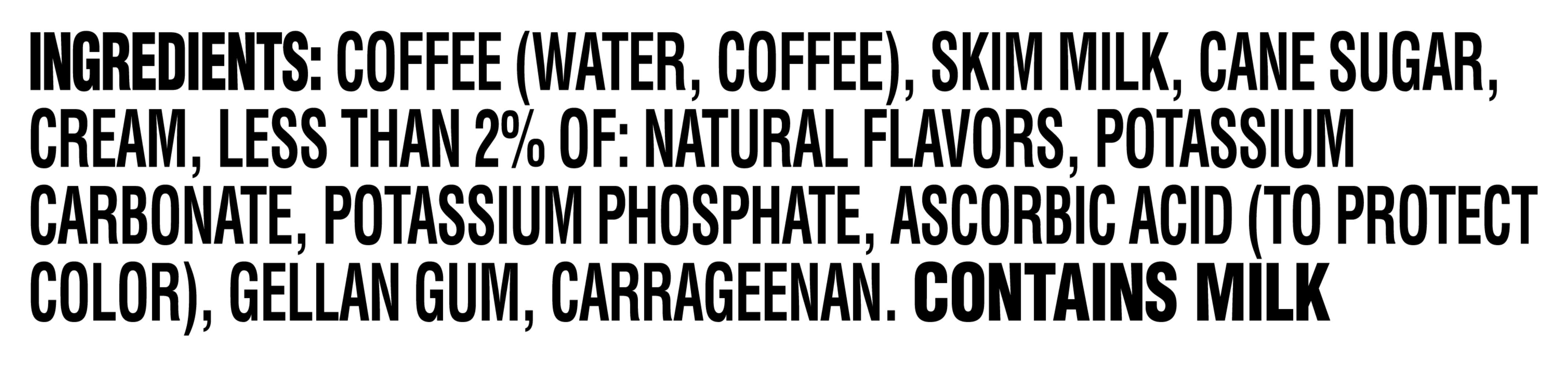 Ingredients: Ingredients: Coffee (Water, Coffee), Skim Milk, Cane Sugar, Cream, Natural Flavors, Potassium Carbonate, Potassium Phosphate, Ascorbic Acid (To Protect Taste), Gellan Gum, Carrageenan.