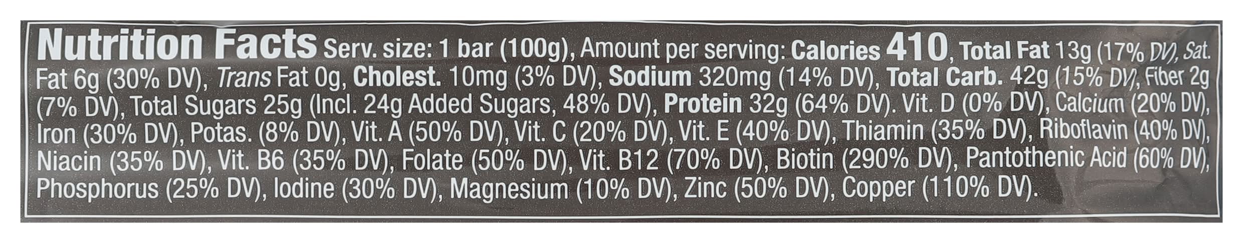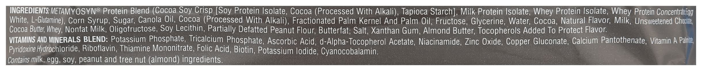 Ingredients: Metamyosyn Protein Blend (Cocoa Soy Crisp [Soy Protein Isolate, Cocoa (Processed with Alkali), Tapioca Starch], Milk Protein Isolate, Whey Protein Isolate, Whey Protein Concentrating White, L-Glutamine), Corn Syrup, Sugar, Canola Oil, Cocoa (Processed with Alkali), Fractionated Palm Kernel and Palm Oil, Fructose, Glycerine, Water, Cocoa, Natural Flavor, Milk, Unsweetened Chocolate, Cocoa Butter, Whey, Nonfat Milk, Oligofructose, Soy Lecithin, Partially Defatted Peanut Flour, Butterfat, Salt, Xanthan Gum, Almond Butter, Tocopherols Added to Protect Flavor, Vitamins and Minerals Blend: Potassium Phosphate, Tricalcium Phosphate, Ascorbic Acid, D-Alpha-Tocopherol Acetate, Niacinamide, Zinc Oxide, Copper Gluconate, Calcium Pantothenate, Vitamin A Palmitate Pyridoxine Hydrochloride, Riboflavin, Thiamine Mononitrate, Folic Acid, Biotin, Potassium Iodide, Cvanocobalamin Contains: Milk, Eggs, Soybeans, Oat, Tree Nuts, Almonds, Corn, Tree Nuts, Wheat, Sesame