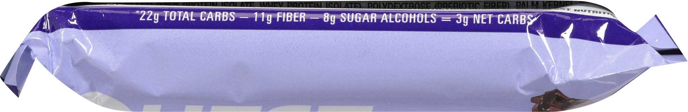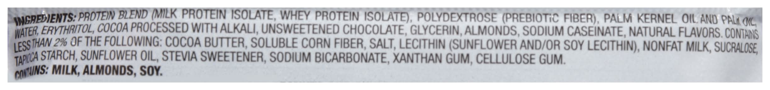Ingredients: Protein Blend (Milk Protein Isolate, Whey Protein Isolate), Polydextrose (Prebiotic Fiber), Palm Kernel Oil and Palm Oil, Water, Erythritol, Cocoa Processed with Alkali, Unsweetened Chocolate, Glycerin, Almonds, Sodium Caseinate, Natural Flavors. Contains Less than 2% of the Following: Cocoa Butter, Soluble Corn Fiber, Salt, Lecithin (Sunflower and/or Soy Lecithin), Nonfat Milk, Sucralose, Tapioca Starch, Sunflower Oil, Stevia Sweetener, Sodium Bicarbonate, Xanthan Gum, Cellulose Gum Contains: Milk, Tree Nuts, Almonds, Soybeans, Peanuts, Tree Nuts