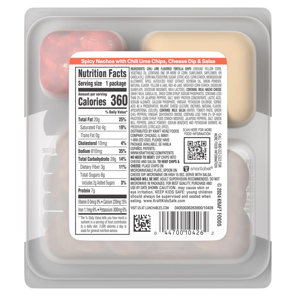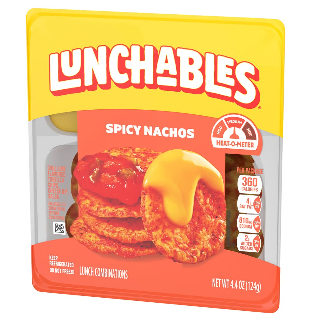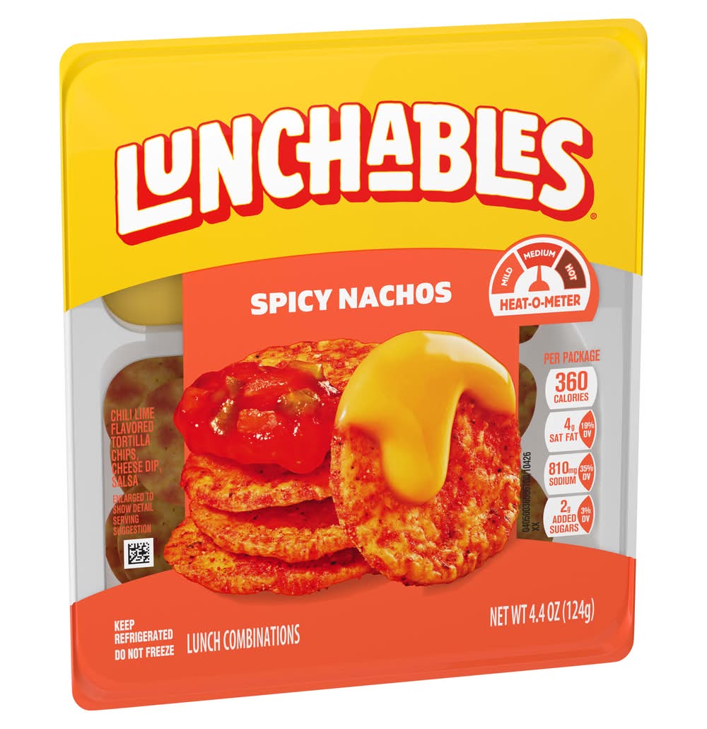 Lunchables Spicy Nacho contains mini tortilla chips dusted with chili lime flavoring, smooth and creamy nacho cheese, and fresh salsa. • Brand: Lunchables • Flavor: Chili lime