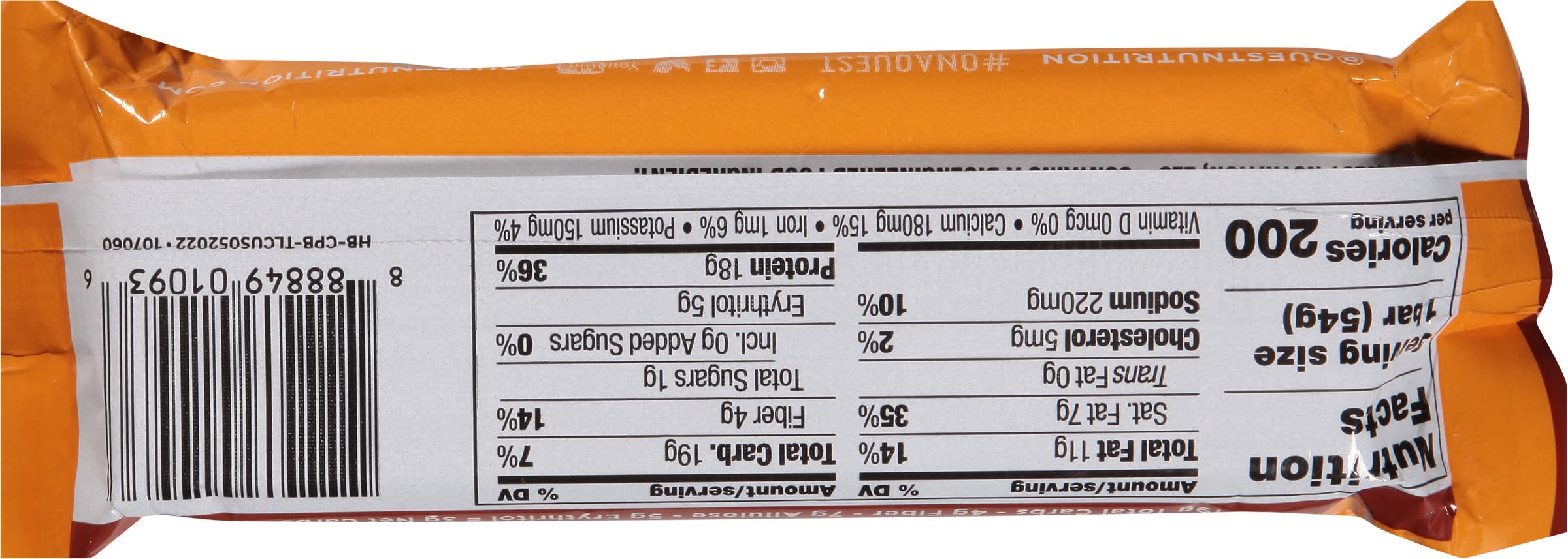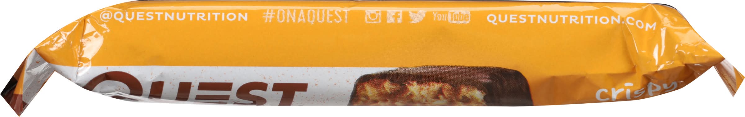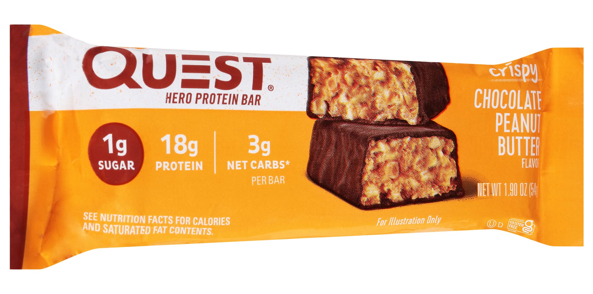A chocolate-coated protein bar packed with a crunchy and chewy core filled with peanut butter and only 1g of sugar. • Brand: Quest • Flavor: Chocolate peanut butter • gluten-free, kosher