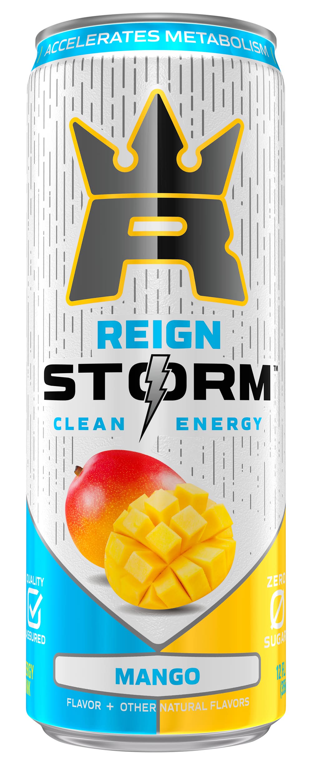 Flavor + other natural flavors. Zero sugar. B7 hair & skin health. Reign Storm Mango is low in calories. Proprietary Plant-Based Energy Blend: natural caffeine, green tea extract (45% egcg), ginseng, guarana, guayusa. Proprietary Immunity & Vitality Blend: biotin (vitamin B7), chromium, vitamin A, vitamin C, zinc, niacin (vitamin B3), pantothenic acid (vitamin B5), vitamin B6, vitamin B12. Caffeine From All Sources: 200 mg per can. Accelerates metabolism. Increased energy. Immunity support. Improves focus. Plant based energy. Never any: High fructose corn syrup. Artificially sourced color. BS claims. Harness the power of great tasting clean energy. PhD-formulated without artificially sourced caffeine or colors, and pasteurized for your safety without added preservatives sodium benzoate or potassium sorbate. Our proprietary energy blend helps boost metabolism, which in combination with exercise and a healthy diet, helps burn fat. This product alone does not produce weight loss. Individual results may vary. Reign Storm is a regulated beverage, NOT a dietary supplement masquerading as a beverage. • Brand: Reign • Flavor: Mango • kosher, vegan,
