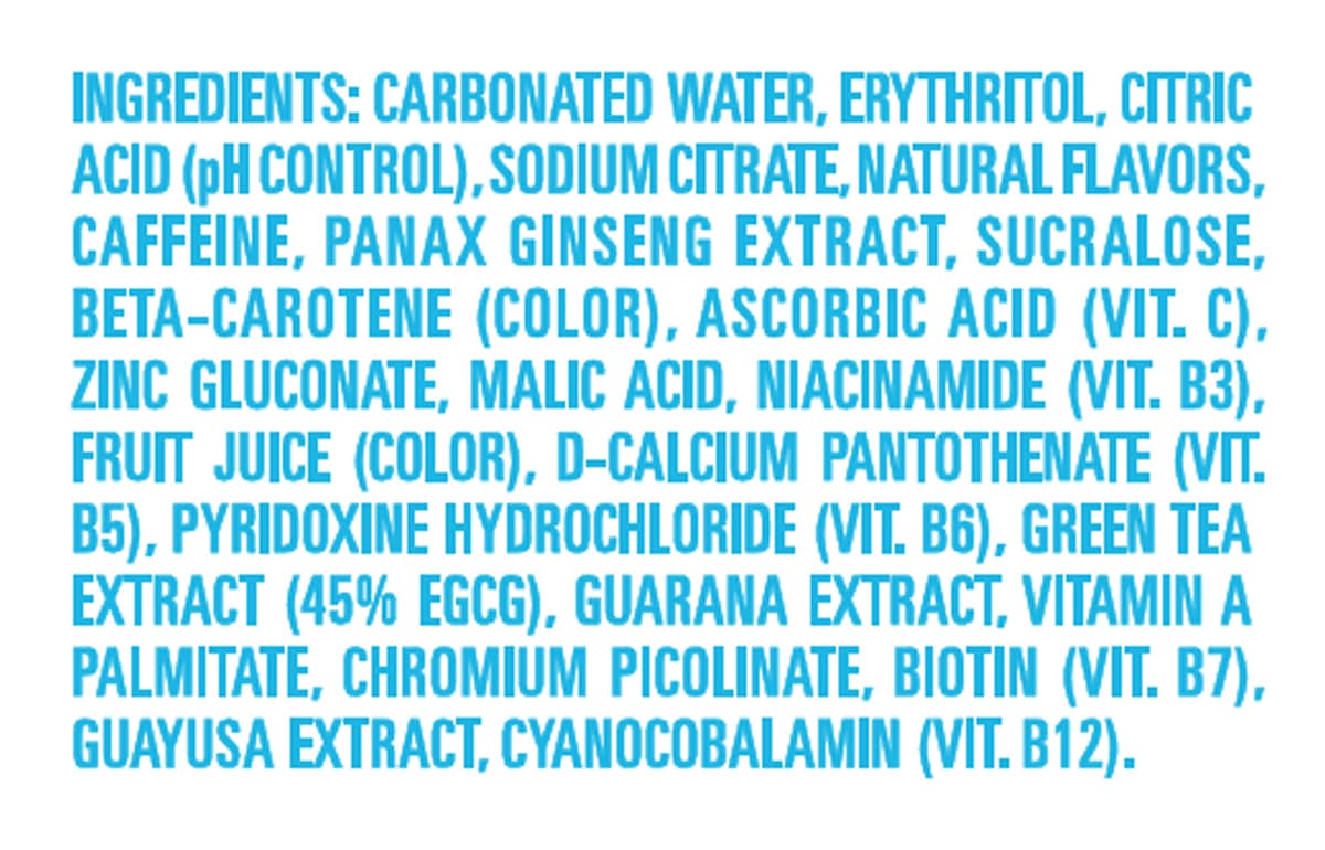 Ingredients: Carbonated Water, Erythritol, Citric Acid (pH Control), Sodium Citrate, Natural Flavors, Caffeine, Panax Ginseng Extract, Sucralose, Beta-Carotene (Color), Ascorbic Acid (Vit. C), Zinc Gluconate, Malic Acid, Niacinamide (Vit. B3), Fruit Juice (Color), D-Calcium Pantothenate (Vit. B5), Pyridoxine Hydrochloride (Vit. B6), Green Tea Extract (45% EGCG), Guarana Extract, Vitamin A Palmitate, Chromium Picolinate, Biotin (Vit. B7), Guayusa Extract, Cyanocobalamin (Vit. B12). Proprietary Immunity & Vitality Blend: Biotin (Vitamin B7), Chromium, Vitamin A, Vitamin C, Zinc, Niacin (Vitamin B3), Pantothenic Acid (Vitamin B5), Vitamin B6, Vitamin B12