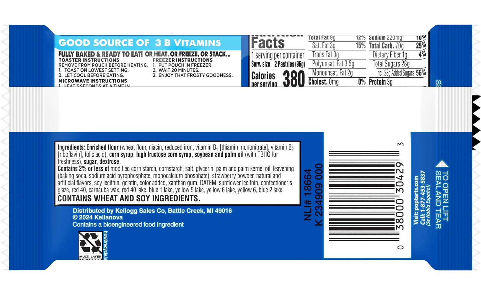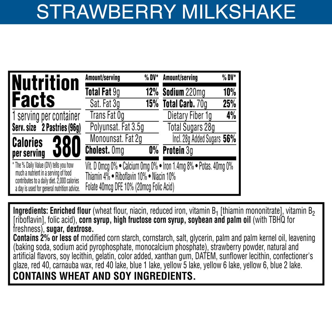 Ingredients: Enriched Flour (Wheat Flour, Niacin, Reduced Iron, Vitamin B1 [Thiamin Mononitrate], Vitamin B2 [Riboflavin], Folic Acid), Corn Syrup, High Fructose Corn Syrup, Soybean And Palm Oil (With Tbhq For Freshness), Sugar, Dextrose. Contains 2% Or Less Of Modified Corn Starch, Cornstarch, Salt, Glycerin, Palm And Palm Kernel Oil, Leavening (Baking Soda, Sodium Acid Pyrophosphate, Monocalcium Phosphate), Strawberry Powder, Natural And Artificial Flavors, Soy Lecithin, Gelatin, Color Added, Xanthan Gum, Datem, Sunflower Lecithin, Confectioner'S Glaze, Red 40, Carnauba Wax, Red 40 Lake, Blue 1 Lake, Yellow 5 Lake, Yellow 6 Lake, Yellow 6, Blue 2 Lake. Contains: wheat, Soy