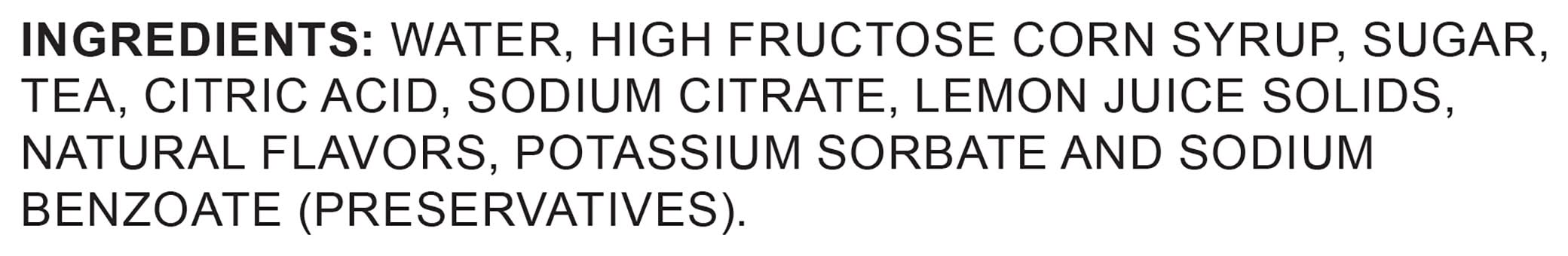 Ingredients: Water, High Fructose Corn Syrup, Sugar, Tea, Citric Acid, Sodium Citrate, Lemon Juice Solids, Natural Flavors, Potassium Sorbate and Sodium Benzoate (Preservatives) Contains: Corn
