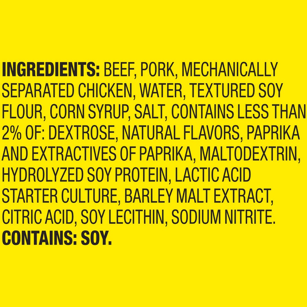 Ingredients: Beef, Pork, Mechanically Separated Chicken, Water, Textured Soy Flour, Corn Syrup, Salt, Contains less than 2% of: Dextrose, Natural Flavors, Paprika and Extractives of Paprika, Maltodextrin, Hydrolyzed Soy Protein, Lactic Acid Starter Culture, Barley Malt Extract, Citric Acid, Soy Lecithin, Sodium Nitrite. CONTAINS: SOY. Contains: Soybeans, Corn, Barley