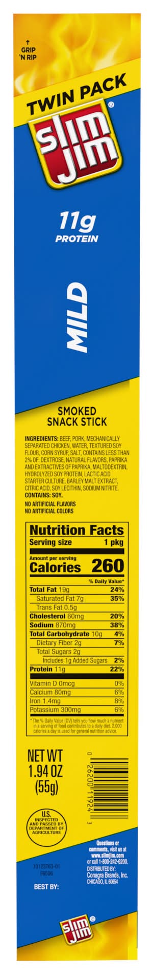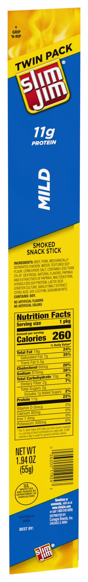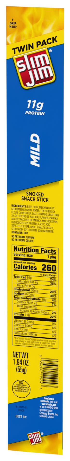 Experience intense, smoky flavor with delicious Slim Jim Mild Snack Sticks. Made with beef, pork and chicken, these meat sticks contain no artificial flavors or colors for full meaty flavor everyone can love. Each meat stick serving is loaded with 11 grams of protein, ideal for protein snacks that kick hunger to the curb and leave you feeling satisfied. These individually wrapped snacks go where you go and are perfect as travel snacks, school snacks or anywhere meat snacks. Slim Jim Mild Meat Sticks offer a bold and tasty way to take on the day. This twin pack contains two individual snacks, so you are ready to hit back when savory cravings hit. Slim Jim keeps it interesting with a full line of beef sticks, snack sticks, pork rinds and jerky. Snap into a Slim Jim®! • Brand: Slim jim • Conagra Brands, Chicago, IL, 60654